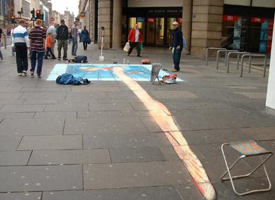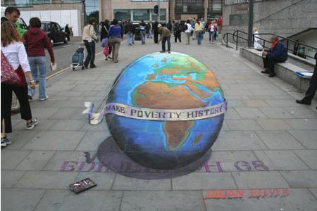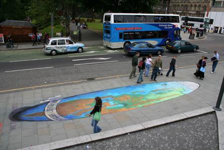 Julian Beever es un artista belga famoso por sus dibujos con pastel en las aceras de Inglaterra, Francia, Almemania, EEUU, Australia y Bélgica. ¿Cual es su particularidad? Beever realiza sus dibujos con anamorfosis: las imágenes se dibujan totalmente deformadas, pero cuando se contemplan desde en ángulo adecuado dan la impresión de ser en 3 dimensiones.