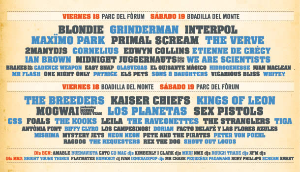 El cartel no tiene el tirón del año pasado, pero no me quejo…. Veré (si Dios quiere) el regreso de The Verve! Espero ver a Ian Brown cantando algún tema de los Stone Roses, a Mogwai interprentando todos los temas de «Young Team» el año de su 10º aniversario, repetiré con Interpol y sus enormes canciones, bailaré al ritmo de los pelotazos de Primal Scream, cantaré las canciones de los siempre interesantes Los Planetas. Veré de refilón viejas glorias como Blondie, Grinderman (Nick Cave), Sex Pistols, The Stranglers. Y descubriré en directo nuevos grupos emergentes como Shout Out Louds, We Are Scientists, Los Campesinos!, Glasvegas, Foals,…
