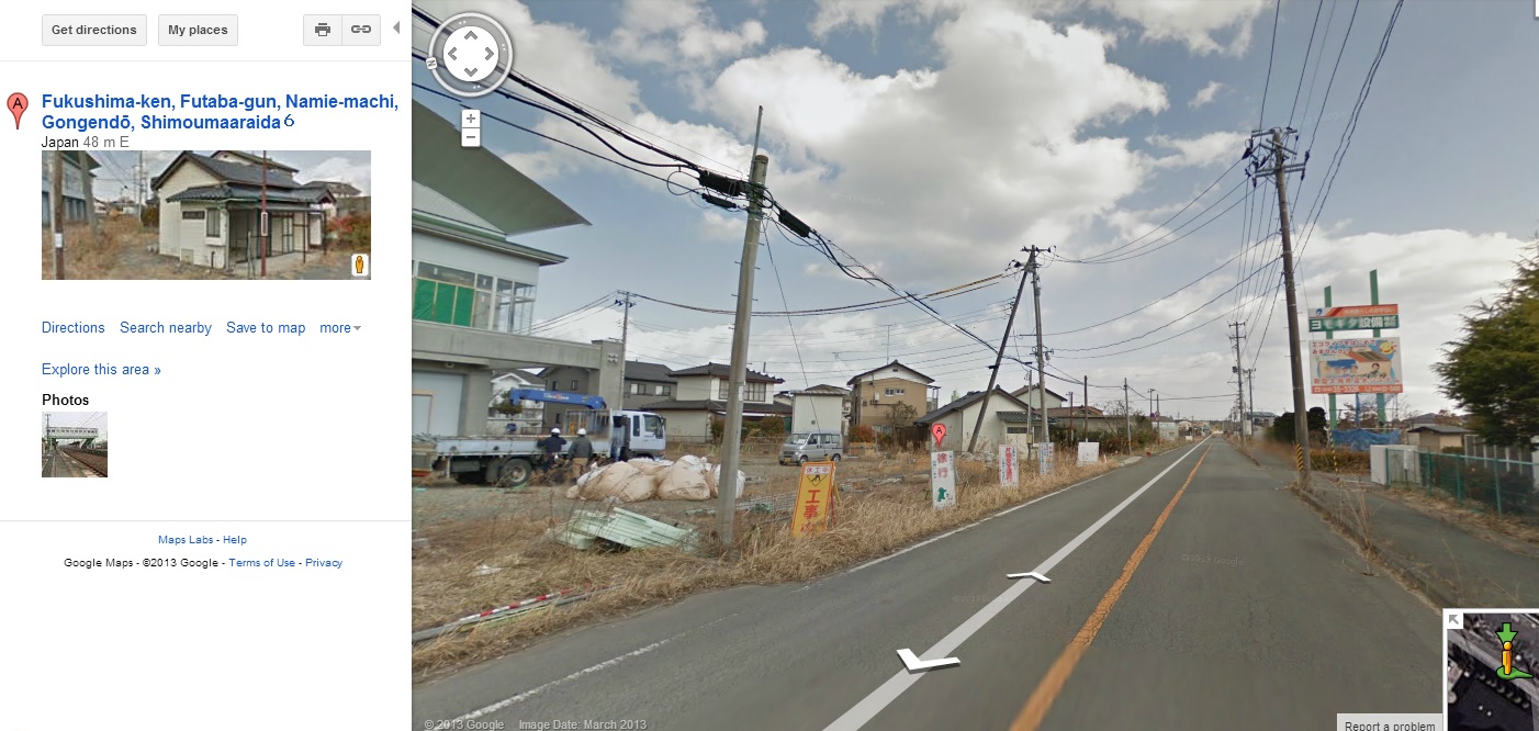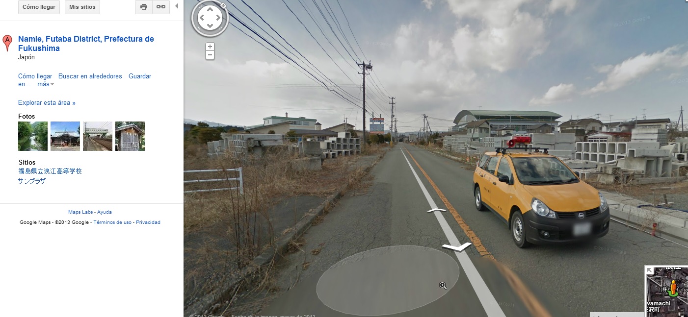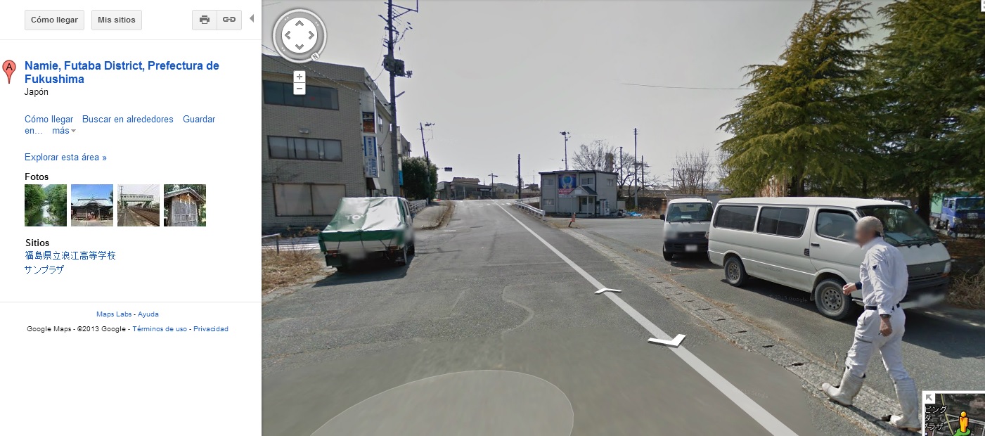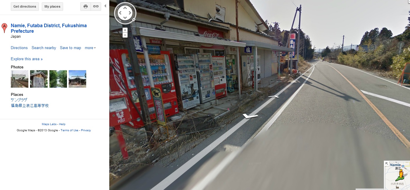 Por primera vez desde hace dos años, se pueden ver imágenes de las calles de Namie, un pueblo japonés situado a sólo unos kilómetros de la costa arrasada por el tsunami y de la central nuclear de Fukushima. Sus 21,000 habitantes fueron evacuados «con lo puesto» y no han podido regresar desde entonces. El desolador paseo que ha hecho el coche de Google Street View (invitado por las autoridades locales) muestra calles desiertas, casas derruidas, maleza por todas partes,… Yo he logrado encontrar un par de personas, también se pueden ver algunos coches circulando por la zona (casi siempre de la policia o grúas), y lo que es más impactante…. ¿para quién están funcionando los semáforos?