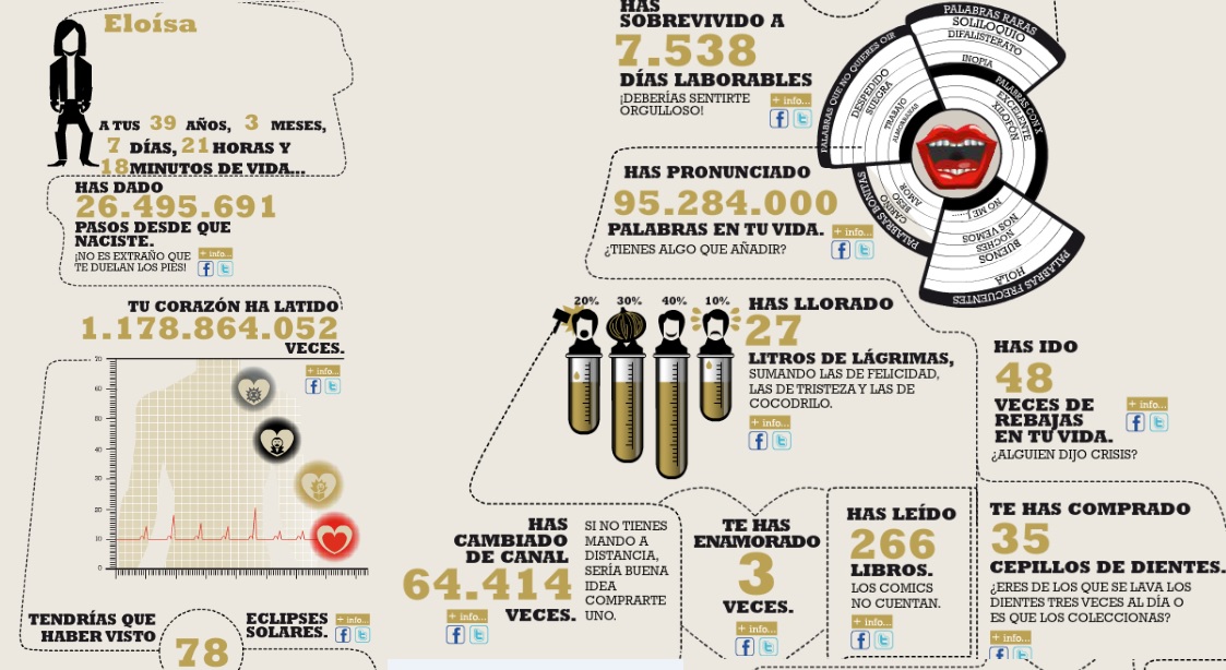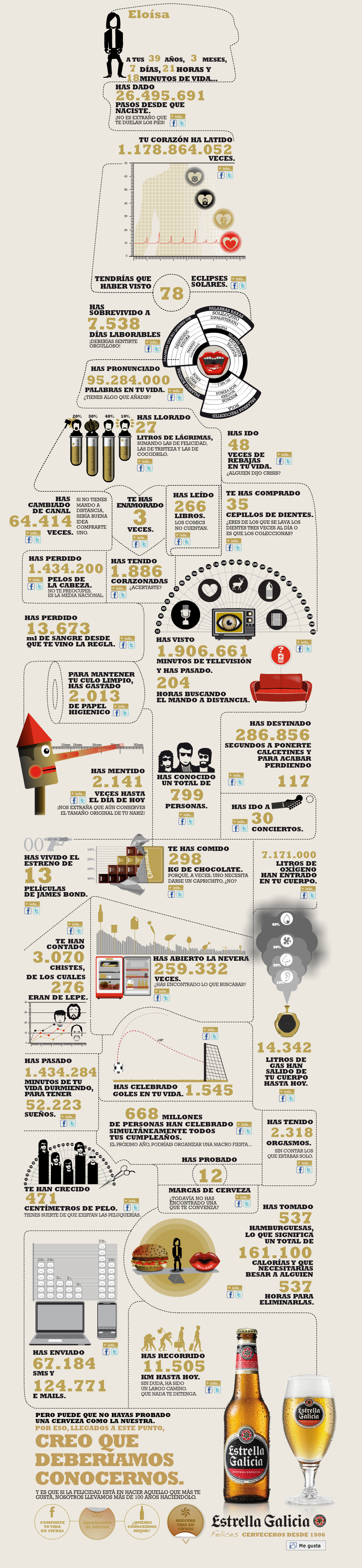 ¿Quién no ha querido saber que a lo largo de tu vida se ha comido 298 kilos de chocolate? ¿O que ha gastado más de 2.000 rollos de papel higiénico? El único dato en que se ha quedado algo corto es el de los 30 conciertos… 30? En serio esa es la media?