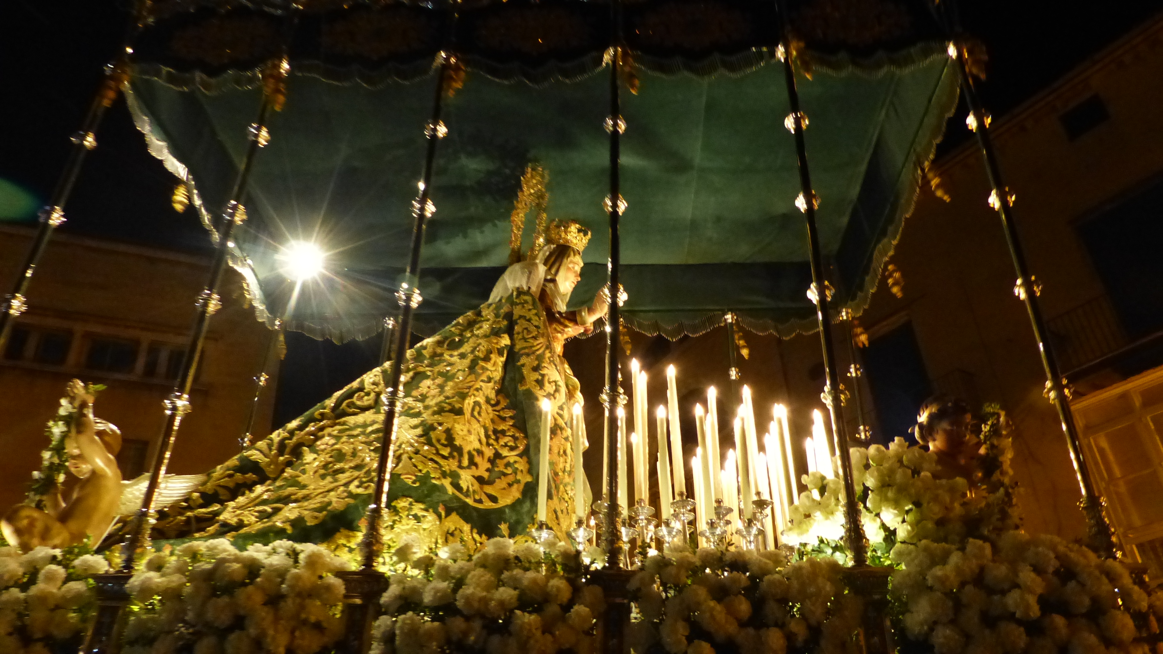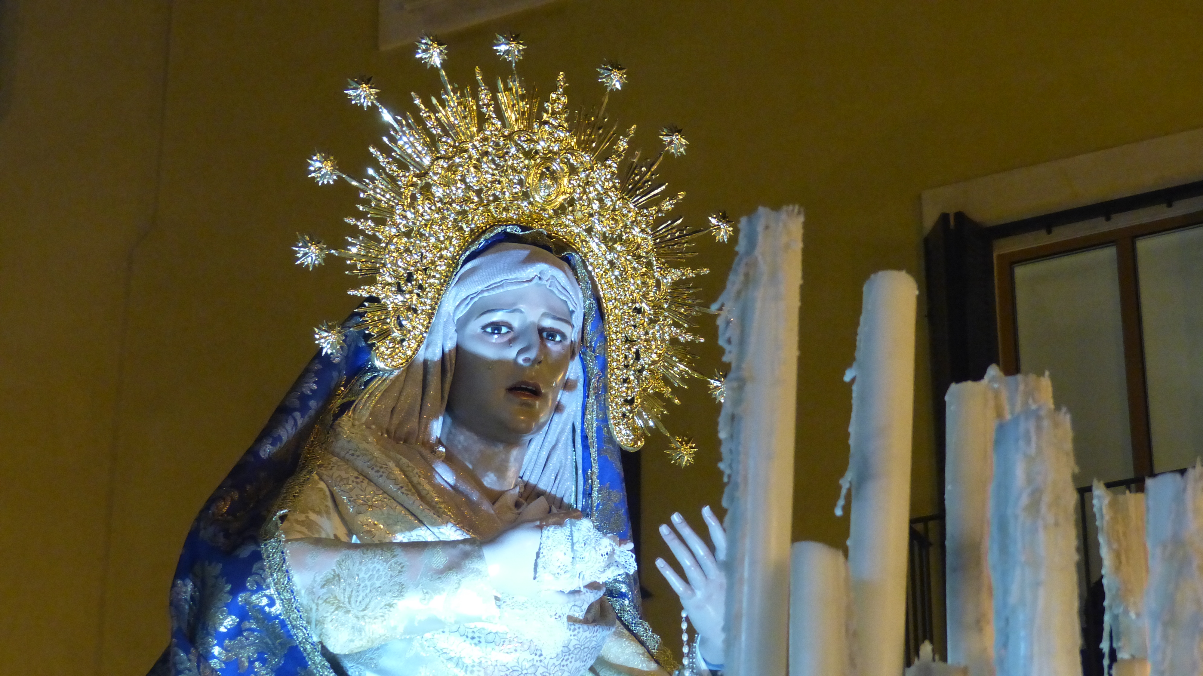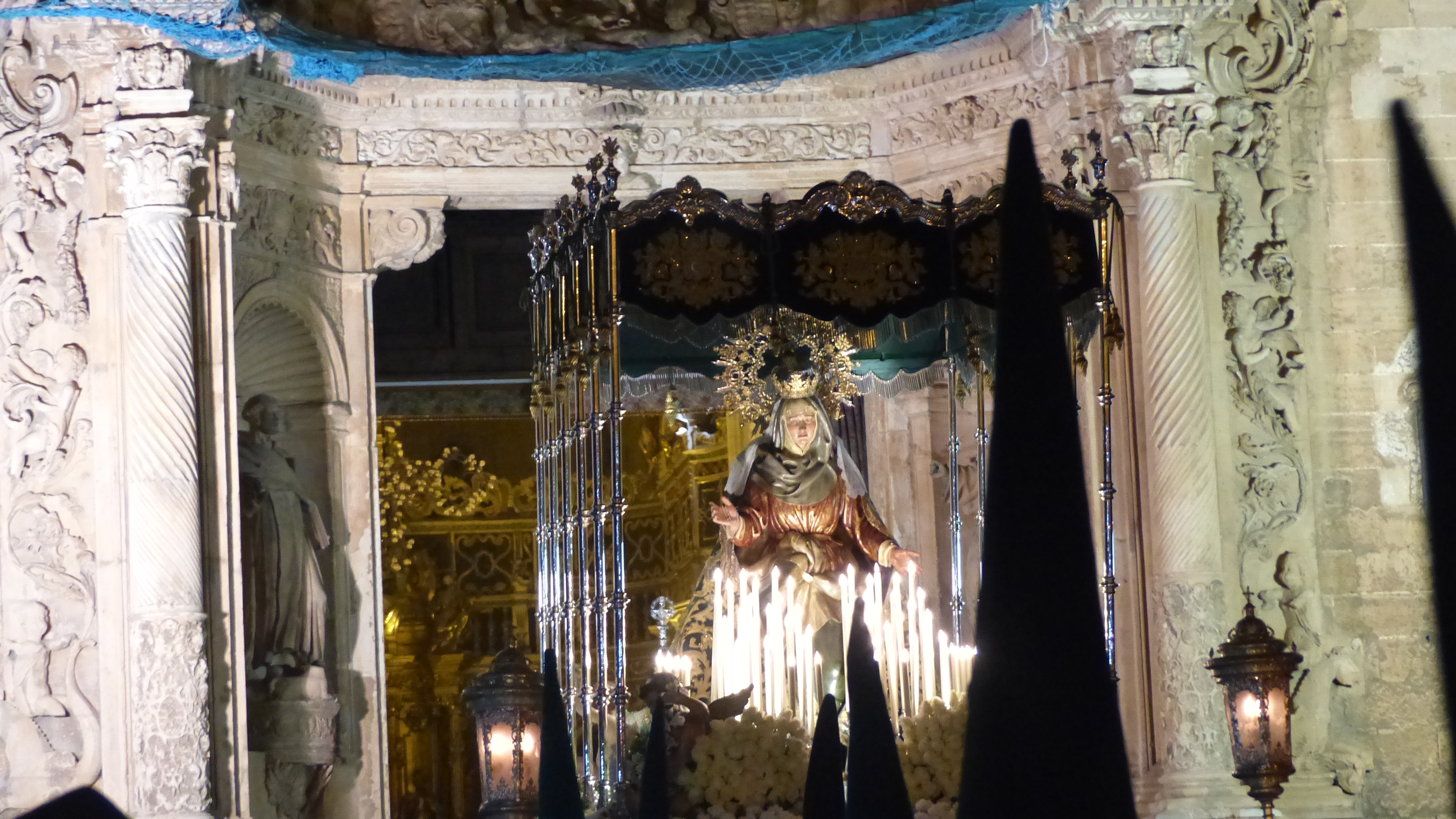 Por la esperada y emocionante salida, ya en noche cerrada, de la Virgen de la Esperanza a través de esa estrecha puerta, casi rozando el dintel. Público con cámara y móvil en mano, flashes,… se nota que es la estrella de la noche.