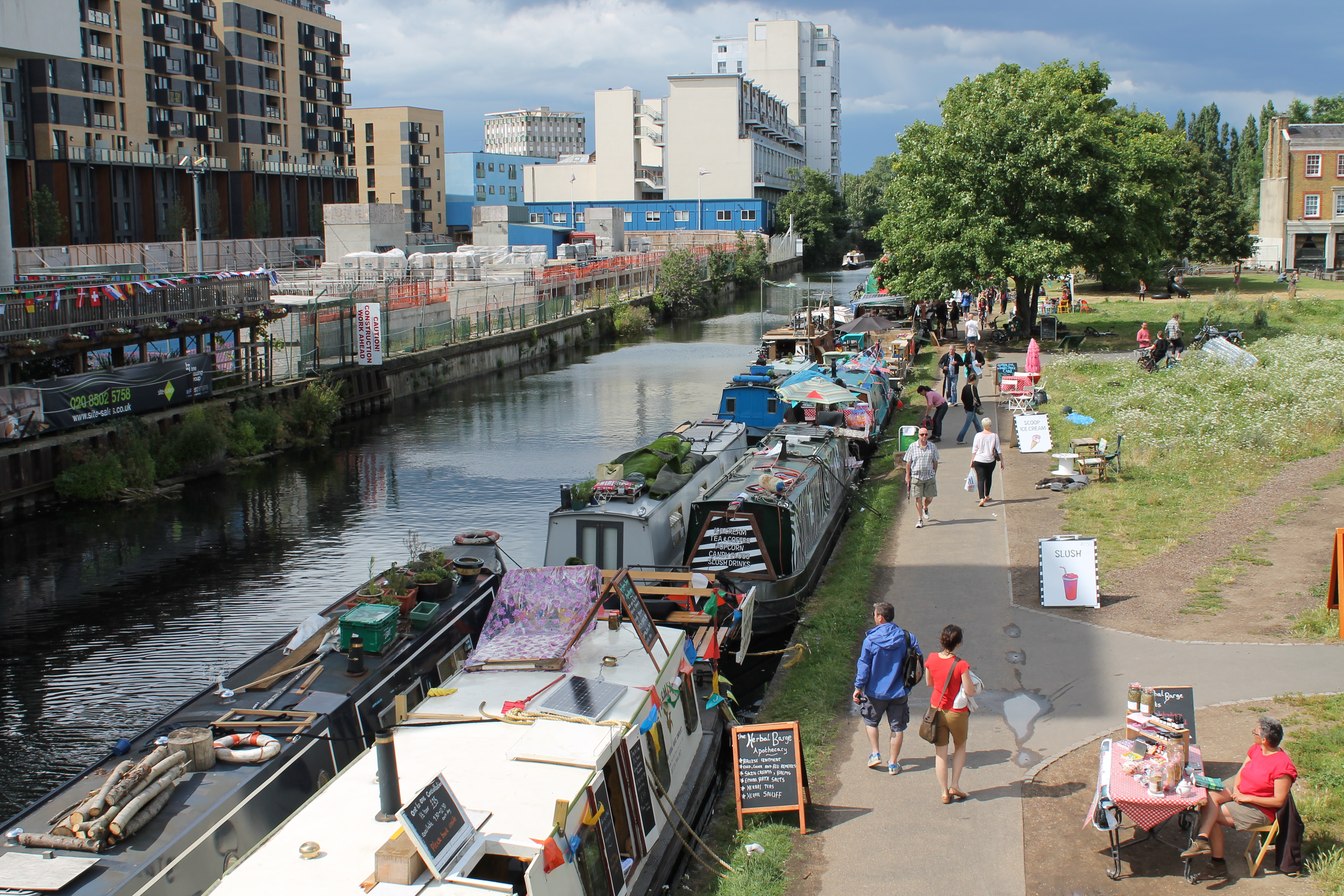 Siguiendo el extremo oriental las ramificaciones se desvían hasta la ciudad olímpica, pero si continúas el canal principal pasas por Mile End donde hay un mercado flotante y llegas hasta Limehouse, cerca de Canary Wharf, ya con salida al Támesis.