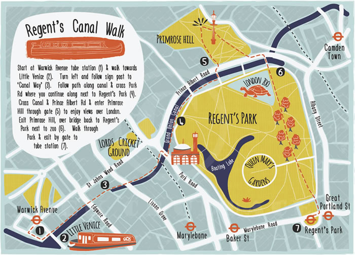 El libro The Regent’s Canal de David Fathers te muestra la rutas en bonitas ilustraciones.