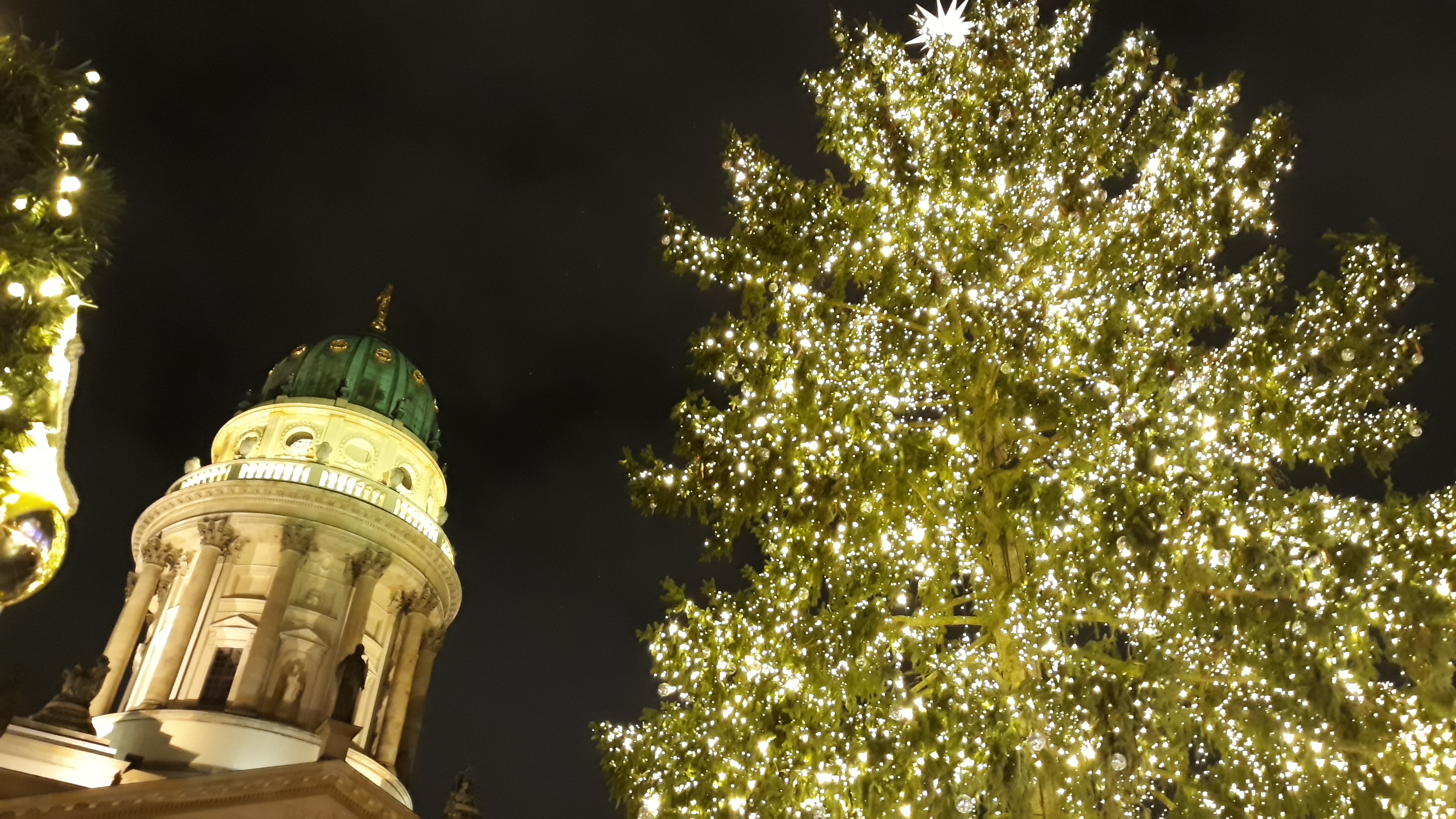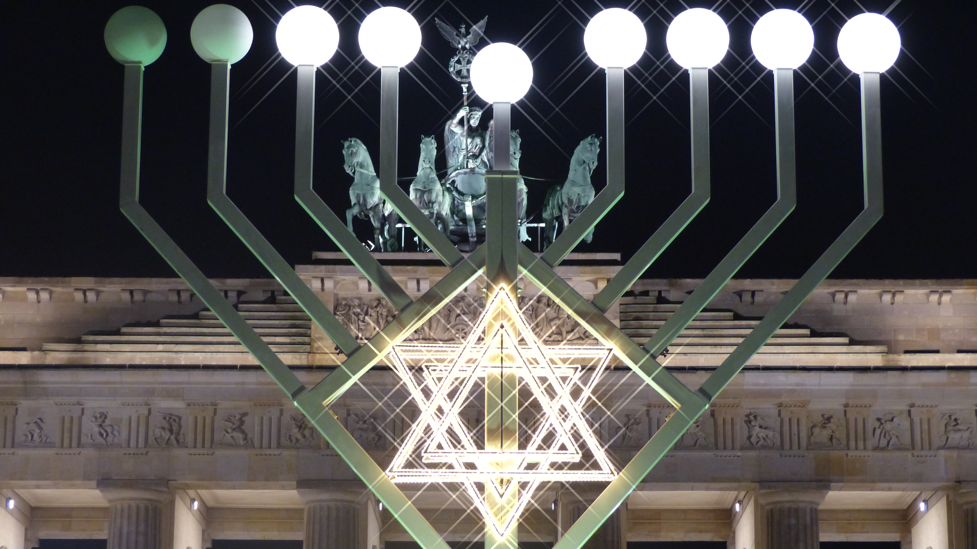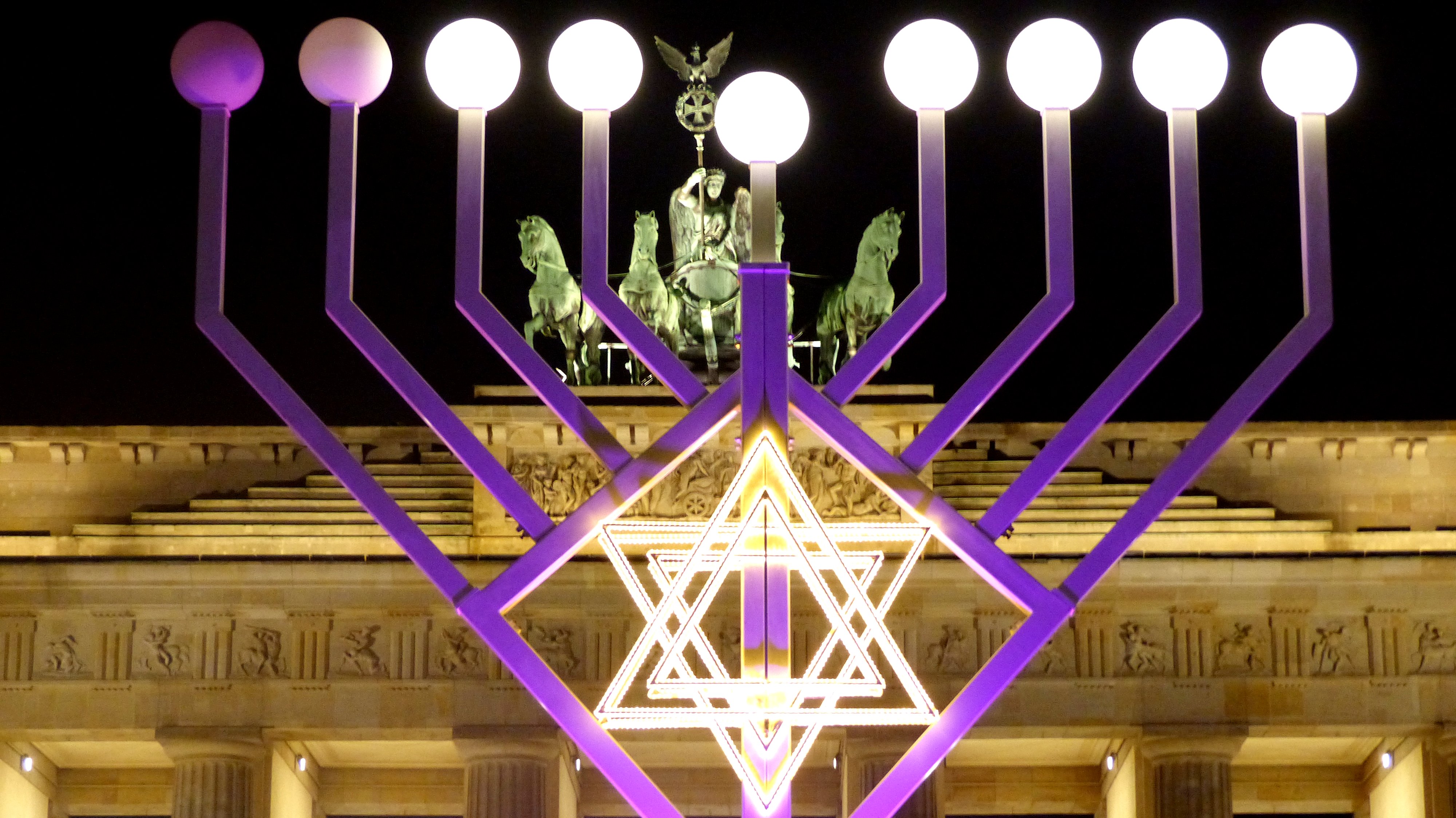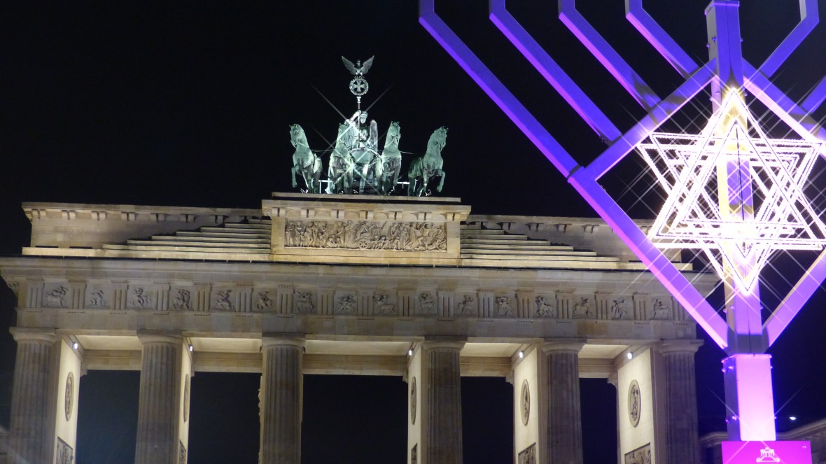 También la Puerta de Brandeburgo está especialmente bonita con el árbol de navidad y con el menorá judío (candelabro de siete brazos) para celebrar el Hanukkah.