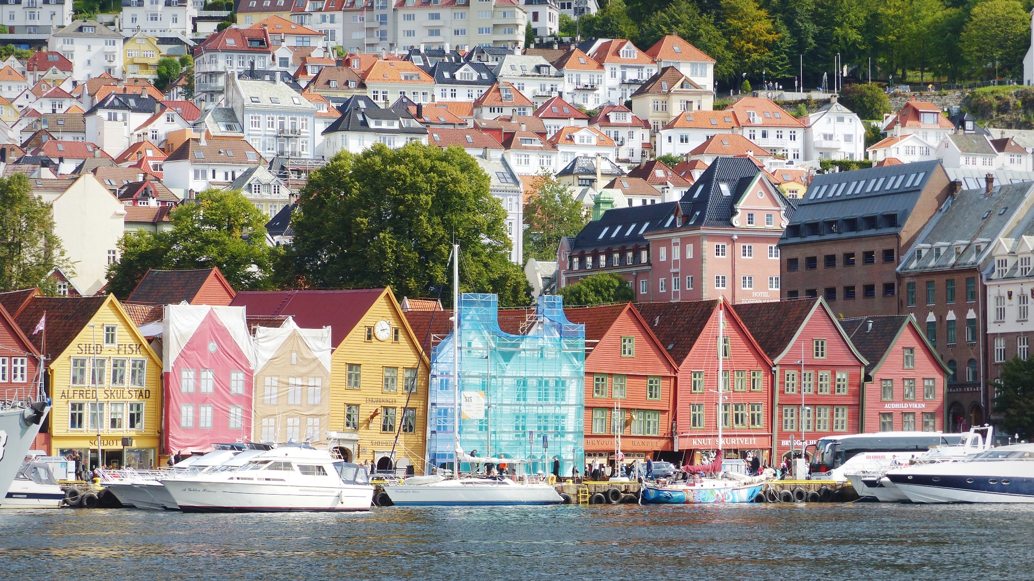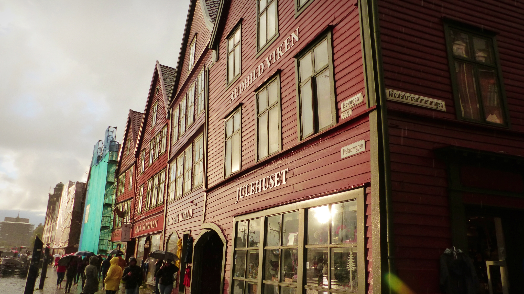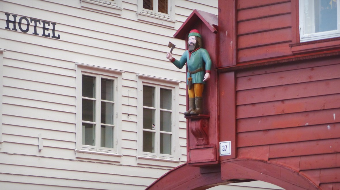 Lo que más destaca y el foco principal de atención es el Bryggen, el puerto de casas de madera de la época de la liga hanseática, declarado patrimonio de la humanidad por la UNESCO. Entre las casas hay estrechos callejones llenos de talleres de artesanía, tiendas de recuerdos, etc… Las fachadas son impresionantes, de vivos colores, con emblemas, escudos… A su lado, también imponentes, enormes construcciones (imagen superior) también de la época.