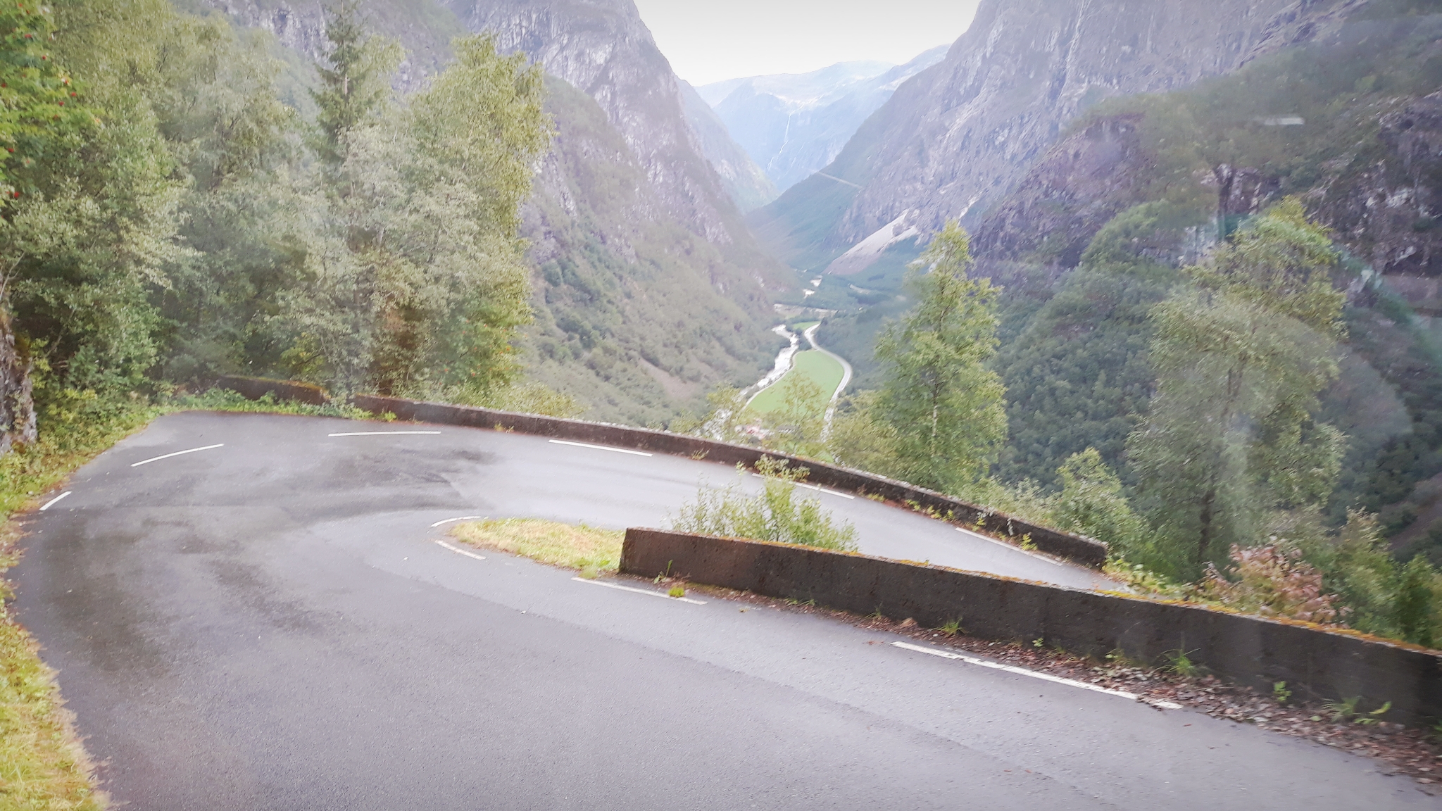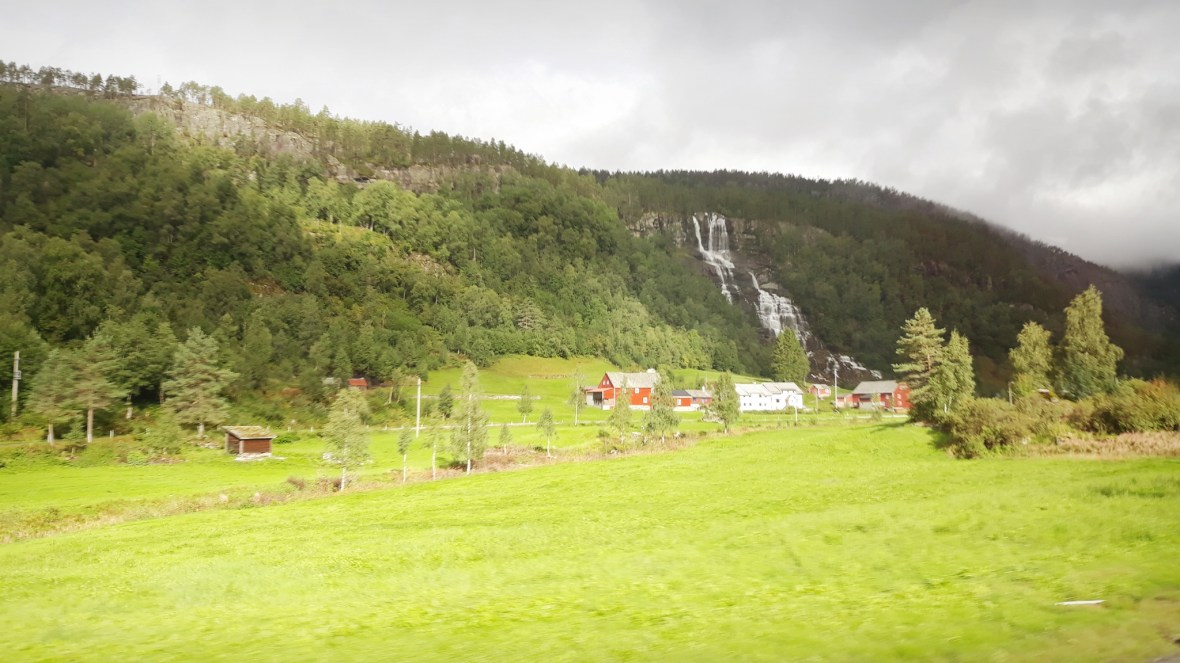 - Autobús Voss-Gudvanhen, a pesar de que existe un túnel que hace más fácil el trayecto, el bus va por lo que me pareció la carretera del fin del mundo (Stalheimskleiva), pendientes con curvas cerradas continuas. Todo un desafío para el estómago. Habría cerrado los ojos si no fuera por el maravilloso paisaje, con varias cascadas y el valle al fondo.