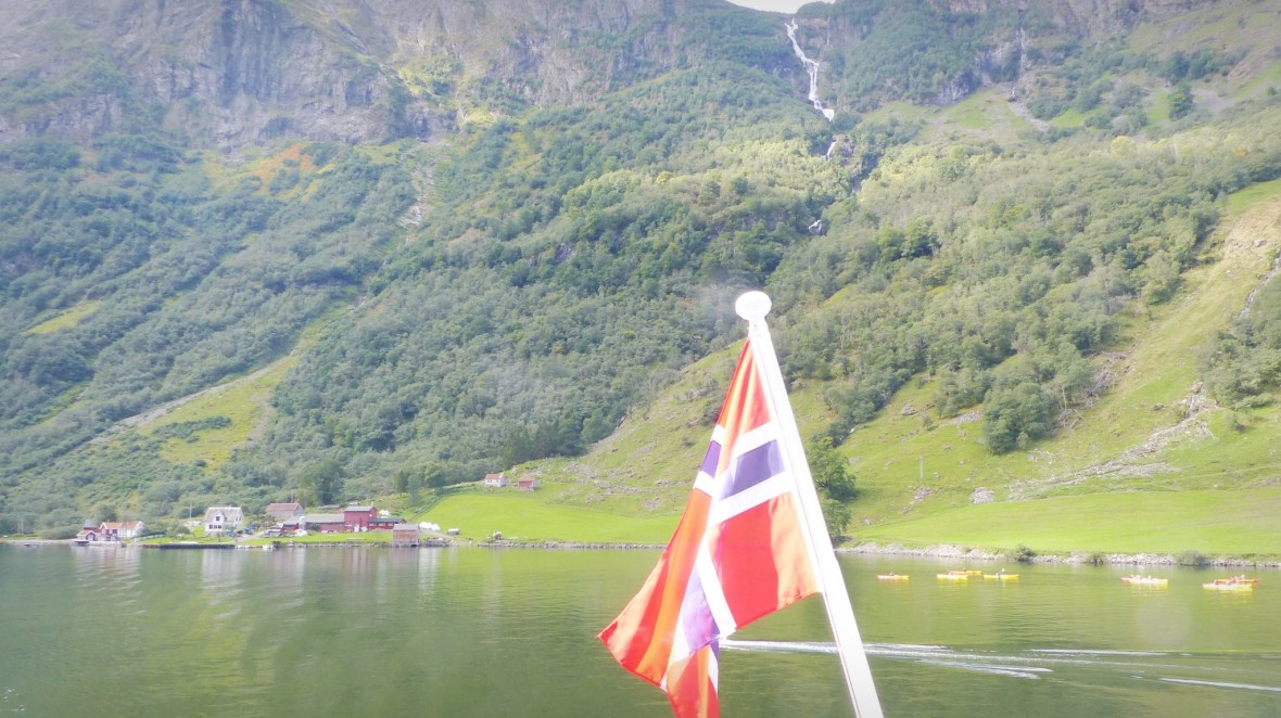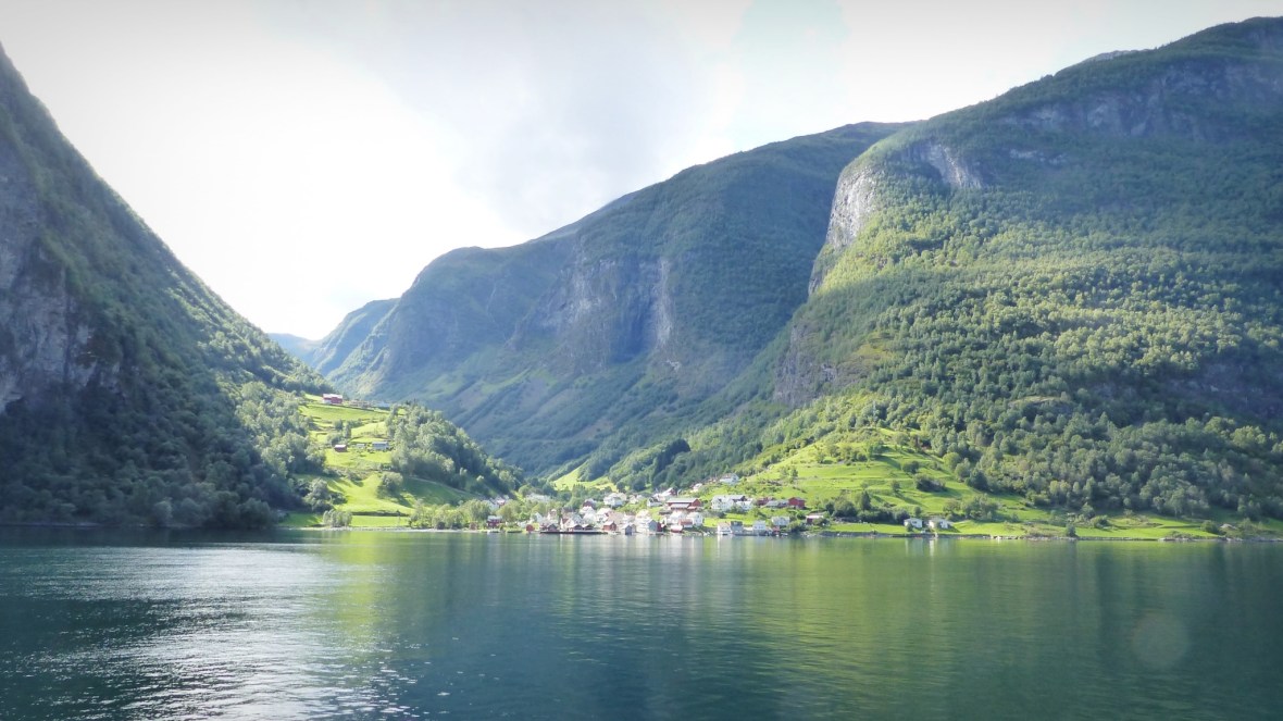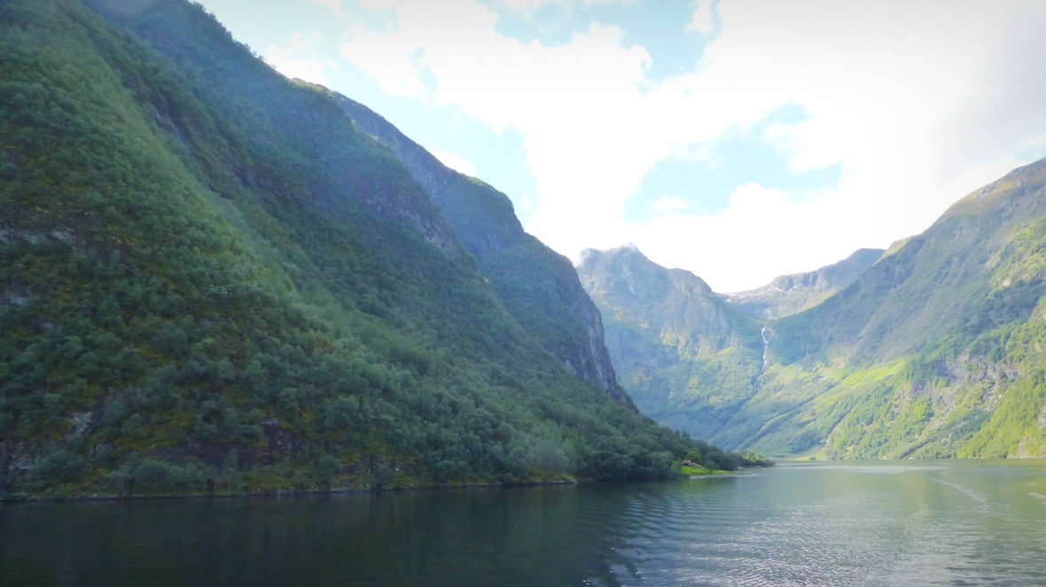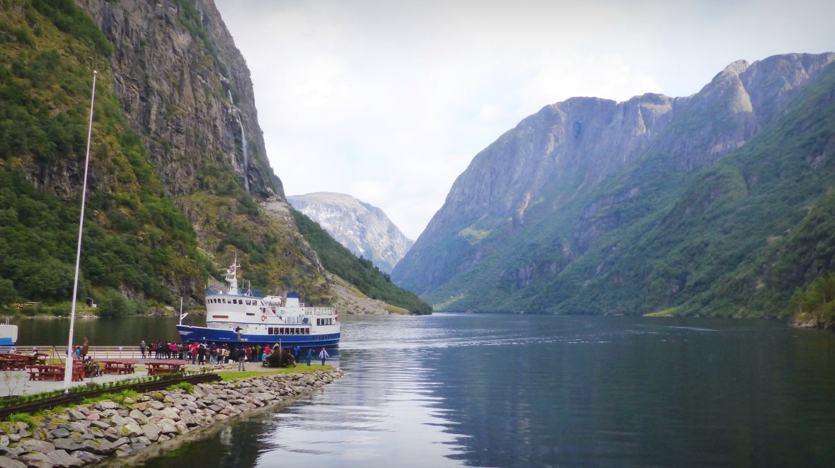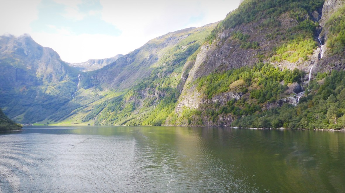 - Gudhaven-Flåm. Dos horas en barco recorriendo un tramo del fiordo Sognefjord (el Nærøyfjorden el tramo más estrecho y bonito, y el Aurlandsfjord en la bifurcación). Una sensación de paz, silencio en inmensidad de la naturaleza, enormes muros de montañas flanquean al barco en su paso por aguas tranquilas, sólo interrumpido por pequeños poblados de casas de colores y cascadas altísimas. A pesar de que había pronóstico de lluvia y durante la mañana cayó algo de agua, durante la travesía tuvimos un tiempo excepcional con bastante sol. Y al llegar a Flåm la naturaleza nos regaló un espectáculo irrepetible: al fondo tras nuestro paso empezaba a llover y salió el arco iris cruzando el fiordo de lado a lado. Uno de los momentos más mágicos que he vivido. Piel de gallina y ganas de llorar ante tanta belleza.