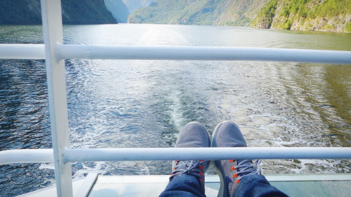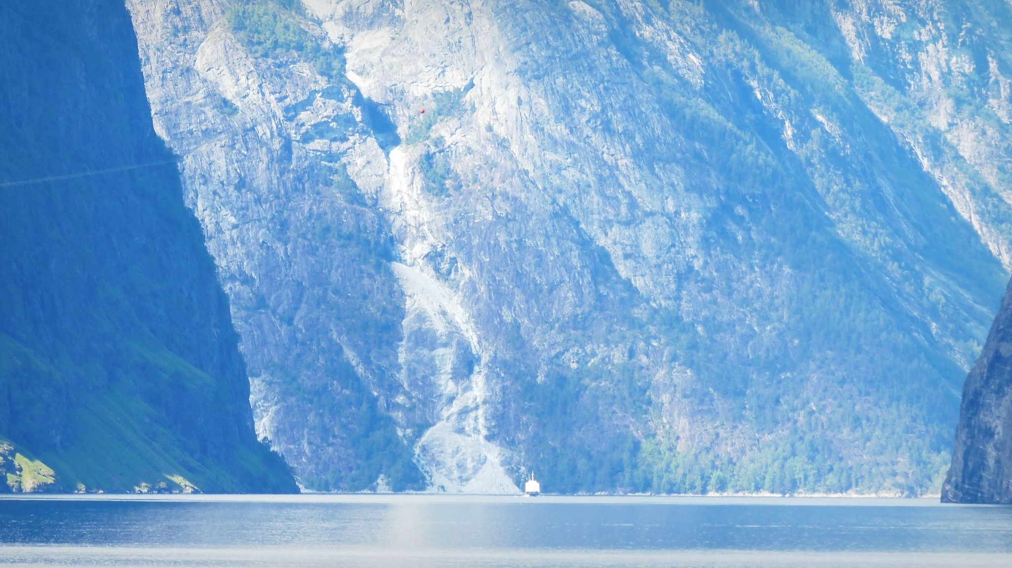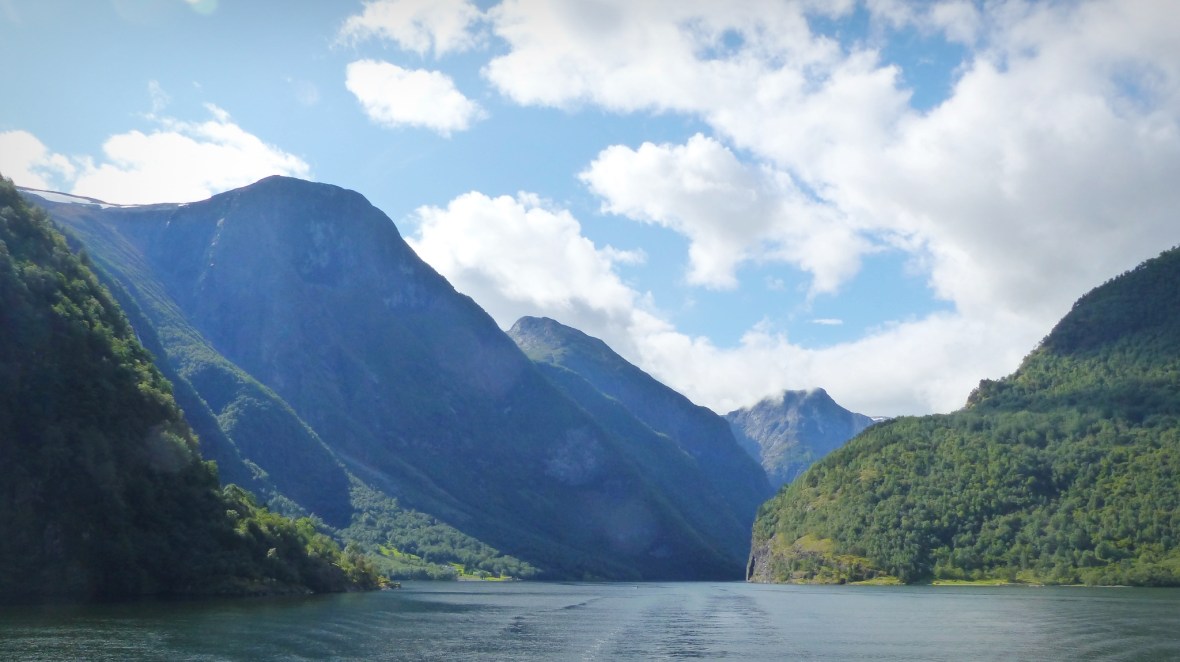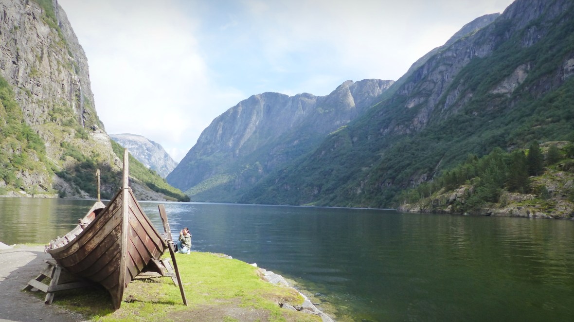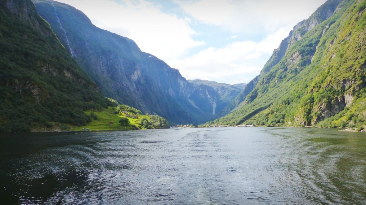 - Gudhaven-Flåm. Dos horas en barco recorriendo un tramo del fiordo Sognefjord (el Nærøyfjorden el tramo más estrecho y bonito, y el Aurlandsfjord en la bifurcación). Una sensación de paz, silencio en inmensidad de la naturaleza, enormes muros de montañas flanquean al barco en su paso por aguas tranquilas, sólo interrumpido por pequeños poblados de casas de colores y cascadas altísimas. A pesar de que había pronóstico de lluvia y durante la mañana cayó algo de agua, durante la travesía tuvimos un tiempo excepcional con bastante sol. Y al llegar a Flåm la naturaleza nos regaló un espectáculo irrepetible: al fondo tras nuestro paso empezaba a llover y salió el arco iris cruzando el fiordo de lado a lado. Uno de los momentos más mágicos que he vivido. Piel de gallina y ganas de llorar ante tanta belleza.