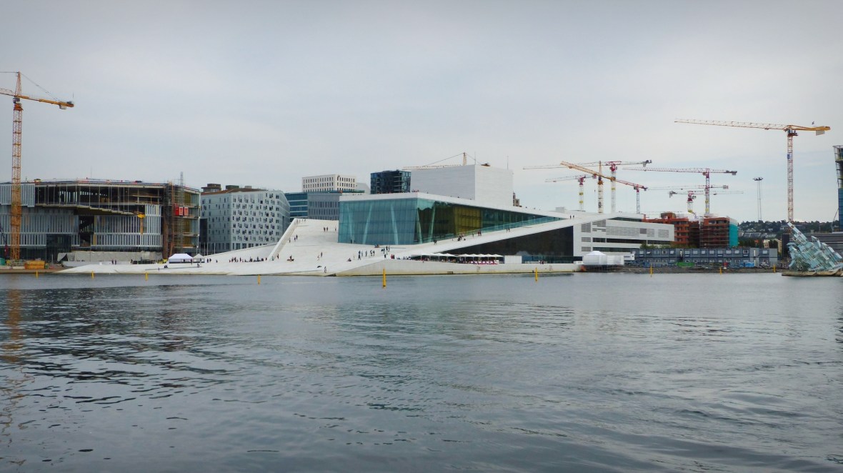 No es la ciudad nórdica que más me ha gustado, habiéndolas visto todas diría que es la que menos, es como la hermana pequeña, aunque tiene su propio encanto con ciertas cosas que me recuerdan a Estocolmo (la estructura de dos ensenadas, el ayuntamiento de ladrillo) y otras a Helsinki (la disposición de las calles con respecto al puerto). Es como una mezcla de todas. Aunque yo diría que sin duda que es la más atrevida y moderna, que no duda en plantar modernos edificios de afamados arquitectos en pleno puerto: la Ópera, cuyo alrededor se está convirtiendo en un moderno distrito (el barcode le llaman) de altos edificios de oficinas y residenciales, con marinas y piscinas de agua de mar para el ocio y el esparcimiento; el Museo Astrup Feamley en el Aker Brygge, que también se está expandiendo por la costa, y hasta planean crear una isla artificial para alargar el paseo marítimo,… Prácticamente la mitad de la ciudad está en obras, la multitud de grúas así lo demuestran.