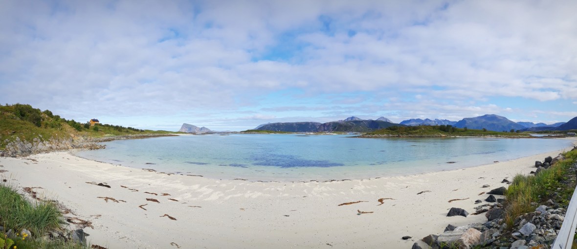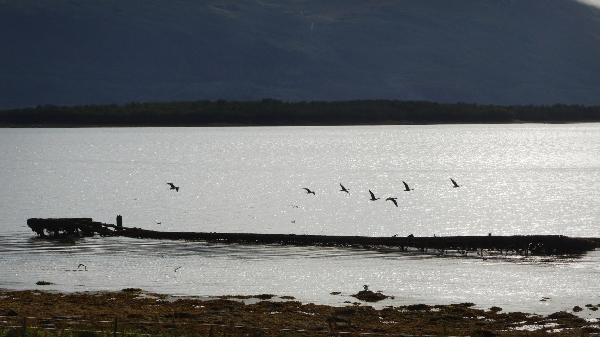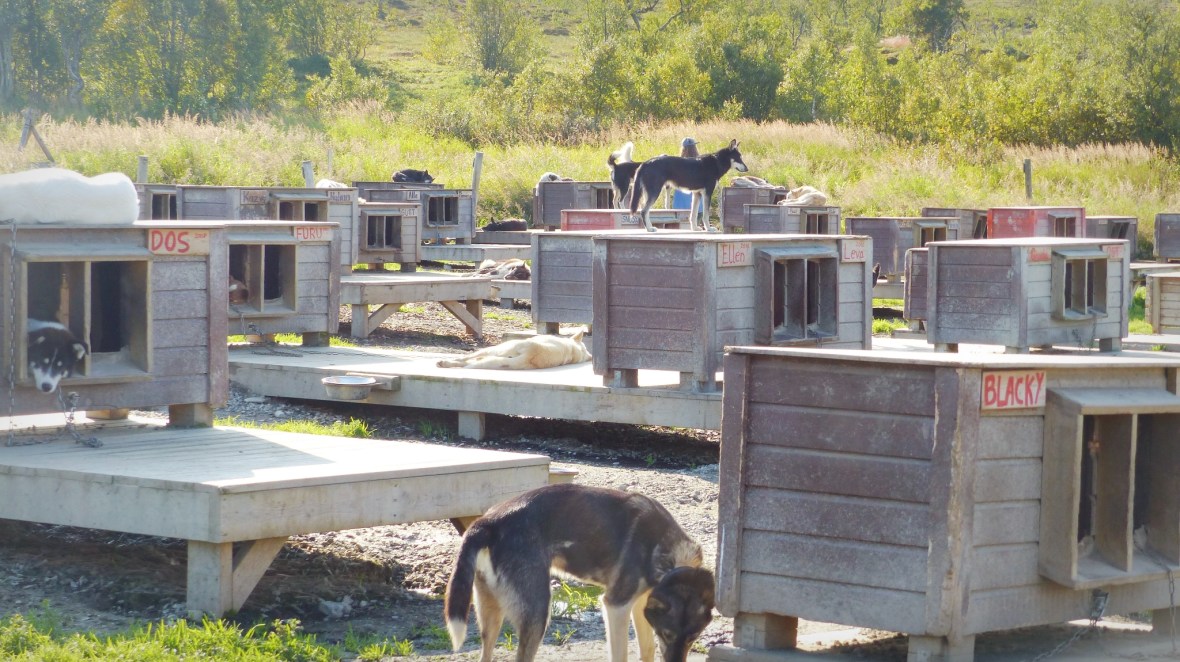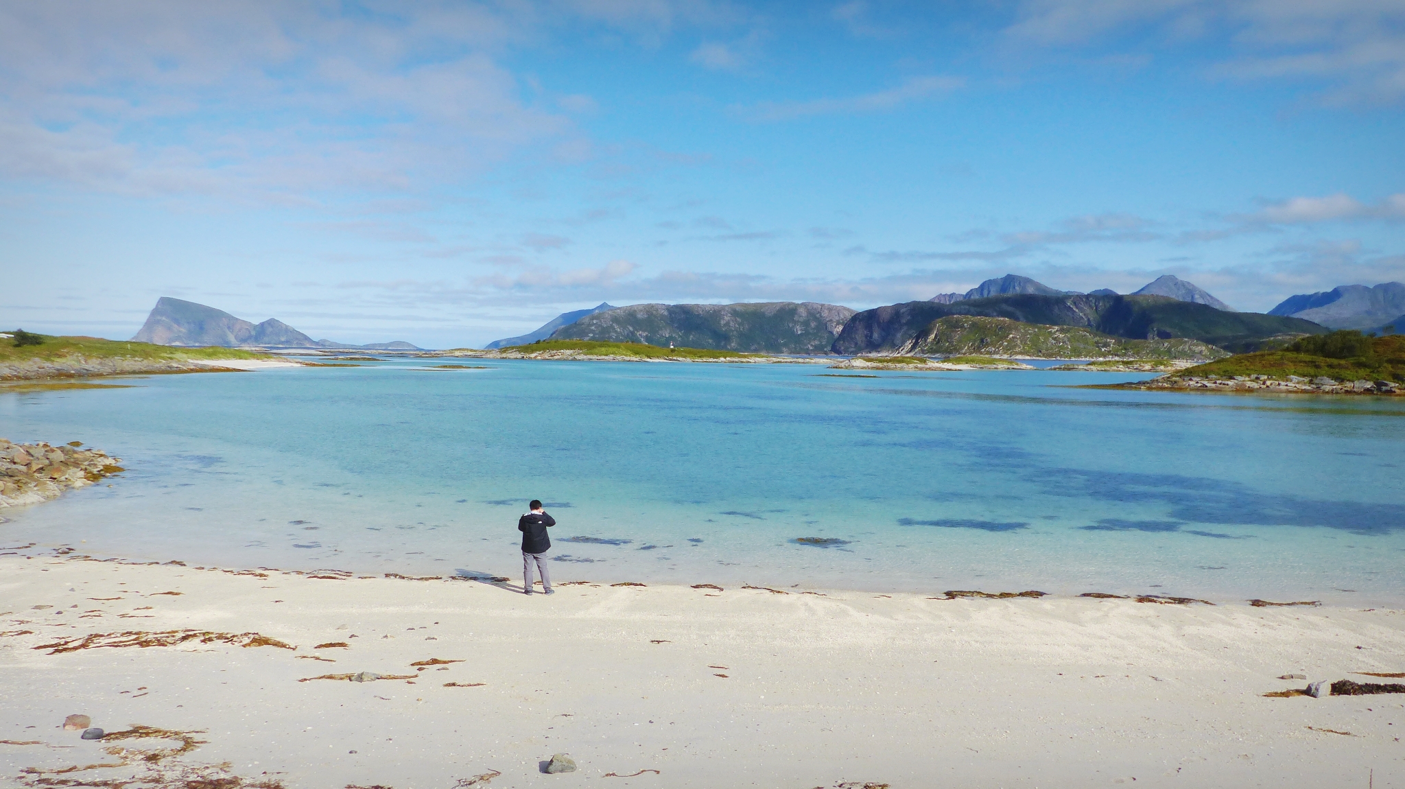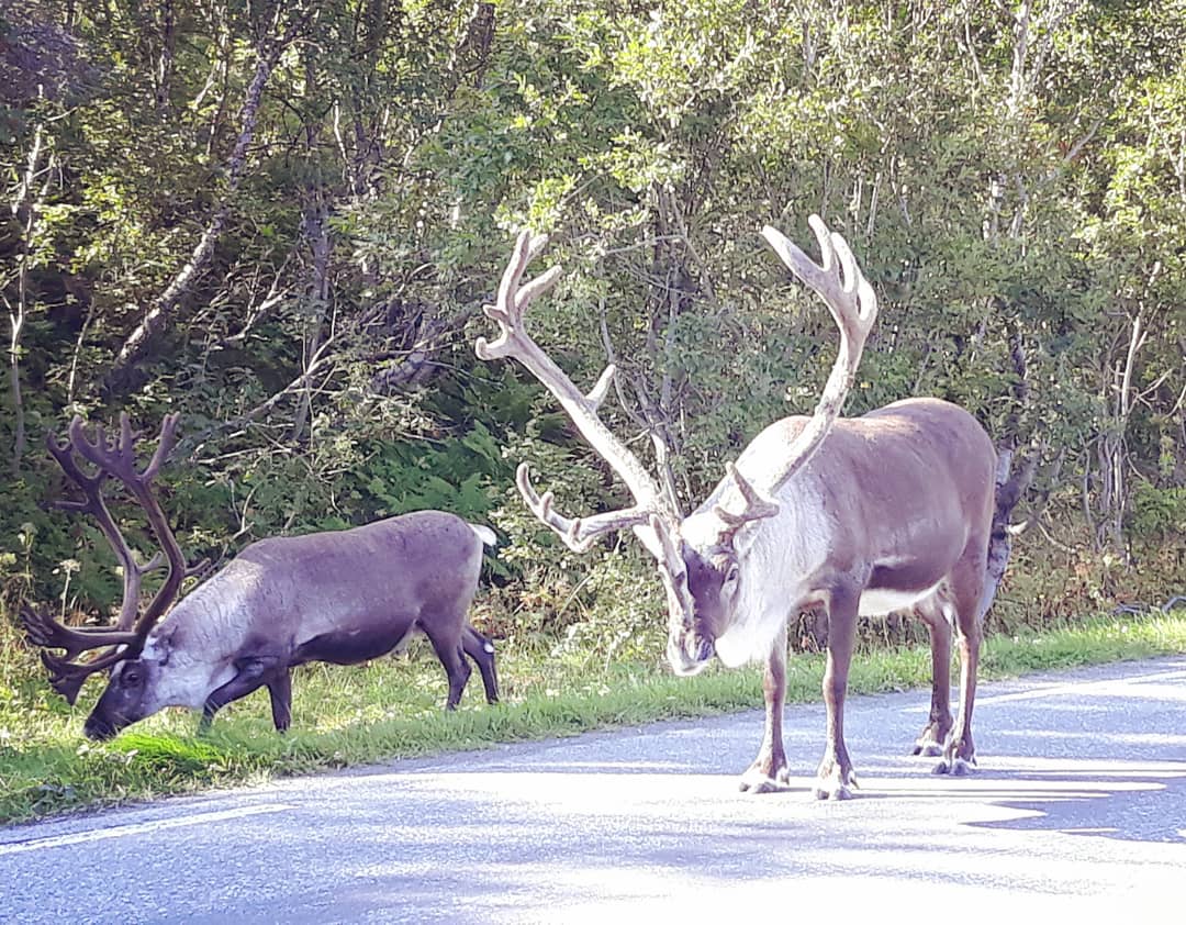 Como yo no estuve en temporada de ninguna de las cosas anteriores, cogí una excursión con Arctic Booking. Lamento no acordarme del nombre de nuestro excelente anfitrión, un señor noruego que nos llevó a un chino y mí en su 4×4 a visitar Kvaløya, la quinta isla más grande de Noruega. Está muy cerca de la ciudad y sin embargo es muy salvaje y llena de contrastes, con pequeños fiordos (muy orgulloso nos enseñó su casa amarilla en Ersfjordbotn), elevadas montañas nevadas (Store Blåmann), y sobre todo las playas de coral con cristalinas aguas de Sommarøy, no podía creer que estuviera en Noruega. Nos llevó a visitar también una granja de más de 300 huskies, los pobres están deseando ya que llegue el frío para salir a correr. Fue un día increíble, sin una nube y con una temperatura agradable de 14-15 grados. El señor nos contó muchas cosas interesantes sobre los noruegos, como que si quieres tener una bandera noruega en casa tienes que izarla y arriarla a unas determinadas horas, si la quieres tener constantemente no puede ser la bandera como tal sino una especie de estandarte sin la cruz; que los idiomas noruego, sueco y danés son tan parecidos que entre ellos se entienden (no les caen demasiado bien los finlandeses); nos contó por donde suelen estar las ballenas; nos enseñó factorías pesqueras y granjas de leche; paramos a tomar un café y un waffle viendo como el Hurtigruten navegaba de camino a Tromsø; nos enseñó como hay zonas con los árboles muy doblados debido a las avalanchas de nieve; vimos los restos del barco alemán Tirpitz en Håkøya; vimos pintura rupestres de hace más de 4.000 años; vimos una granja antigua. Fue un día muy especial. Para colmo nos topamos con un grupito de renos que pararon el tráfico en la carretera!