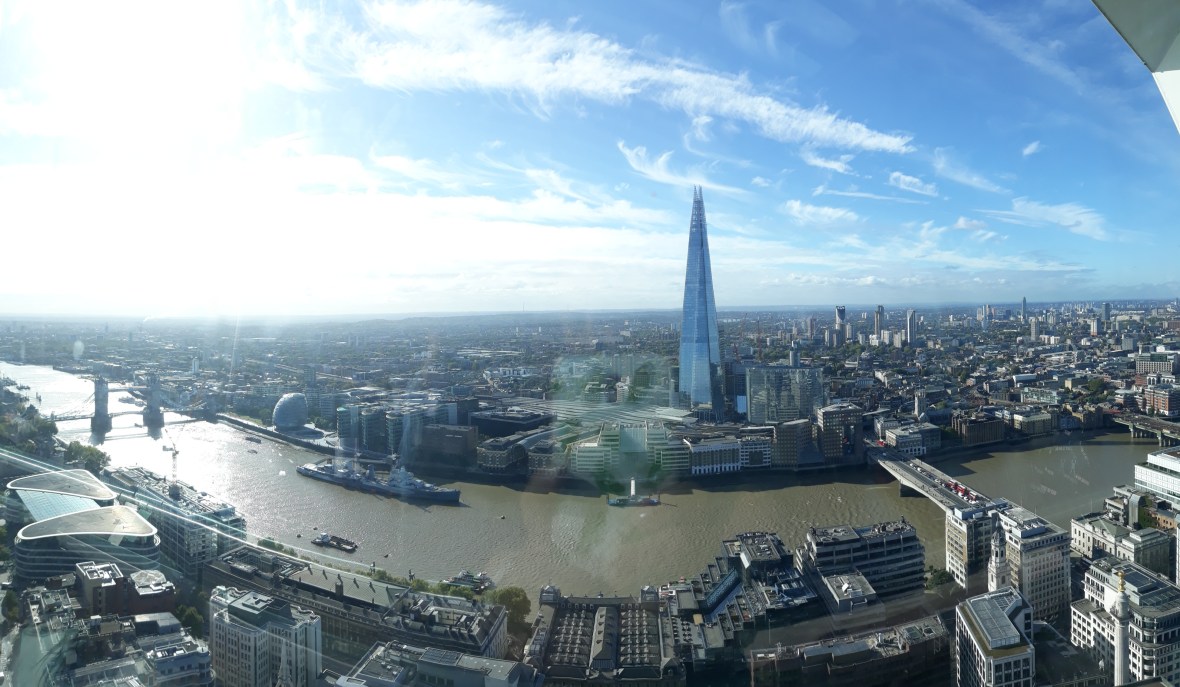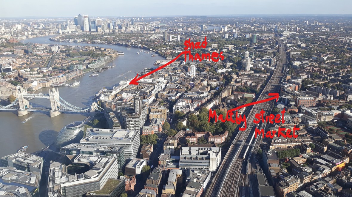 The Shard es caro, son 36 euros en taquilla. Se puede comprar la entrada anticipada y sale algo más barato, pero es una decisión improvisada dado el fantástico día que hace. También se puede ir a uno de los bares y restaurantes y sólo tomar algo, pero te quedas en la planta treinta y pico y no llegas a las setenta dos, que es la última, abierta al aire en la punta. Las vistas son de 360 grados, desde allí se ve el ajetreo de gente que abarrota el mercado, los coches y autobuses rojos cruzando los puentes, las colas para entrar a la Torre de Londres, tienes enfrente el Sky Garden y el resto de la city, y llegas a ver incluso el Big Ben, la London Eye, y el Parlamento. Muy espectacular.
