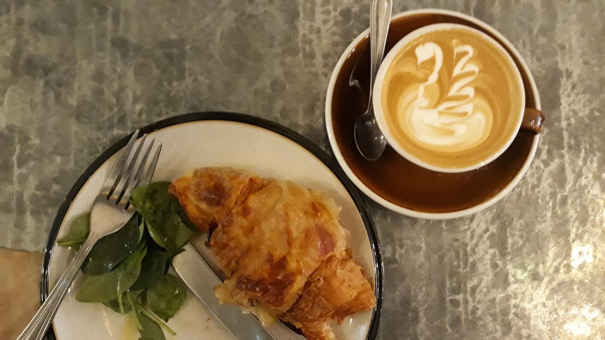 Hoy sí que necesito un café en condiciones y no de la máquina del hotel. Desayuno pues en Exmouth Coffee, un café y un croque-monsieur de jamón y queso por 7 euros. Ya conocía este lugar de la vez que estuve en el Qbic Hotel. El mostrador lleno de delicias caseras es muy fotografiable.