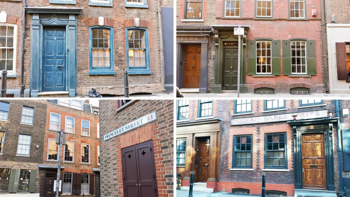 Paseo un poco por el mercado, miro los puestos, busco uno en concreto por un encargo, no lo encuentro… Cada jueves hay mercado especial vintage de cosas antiguas y de segunda mano. No están pues los puestos habituales. Salgo a ver las preciosas calles Fournier Street y Princelet Street, ambas con interesantes fachadas de pasado industrial. En esta zona se ruedan muchas películas, series y anuncios, aprovechando las características de las casas. Hay muchos grafitis y muchos grupos con guías que los van recorriendo.