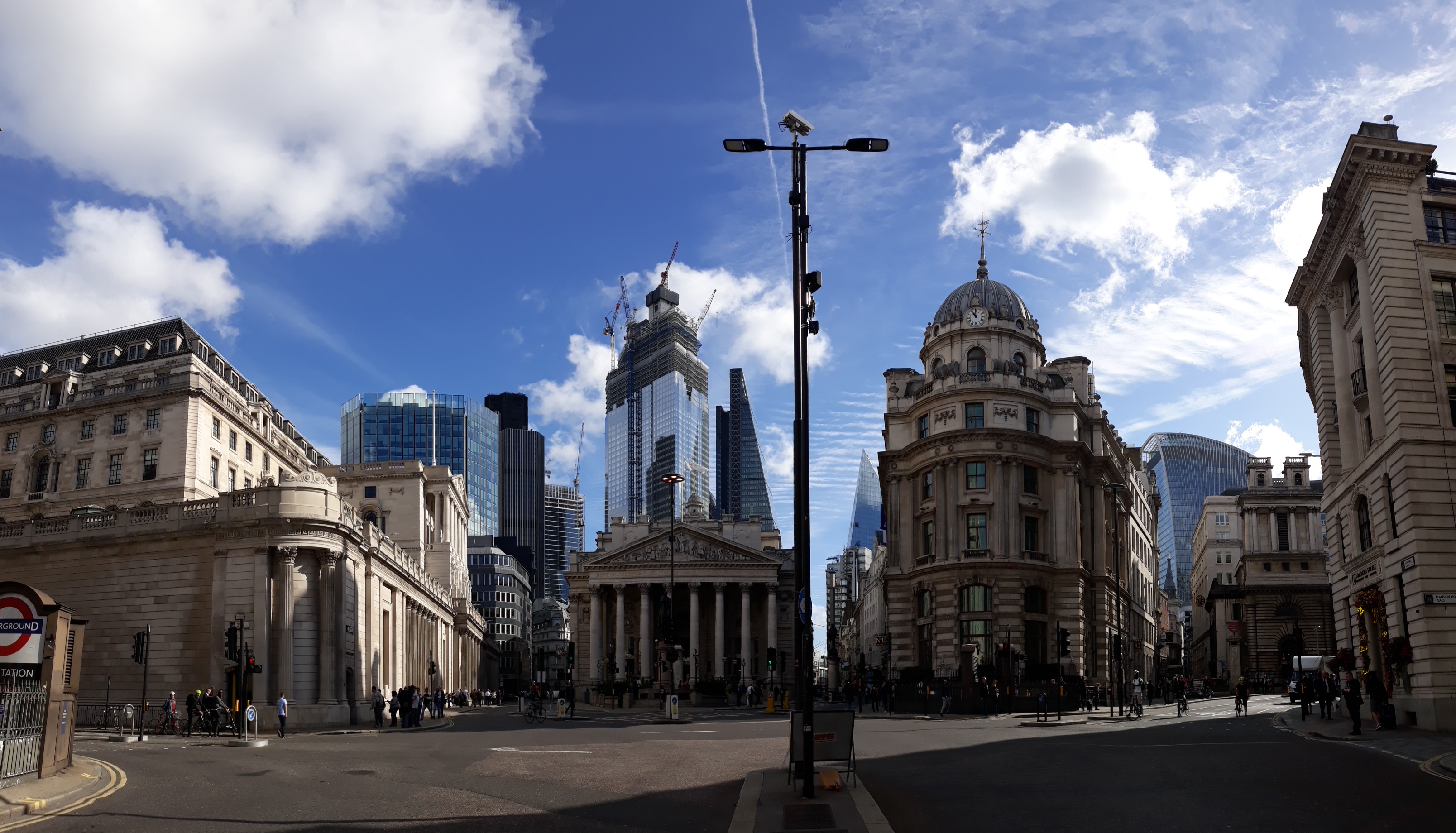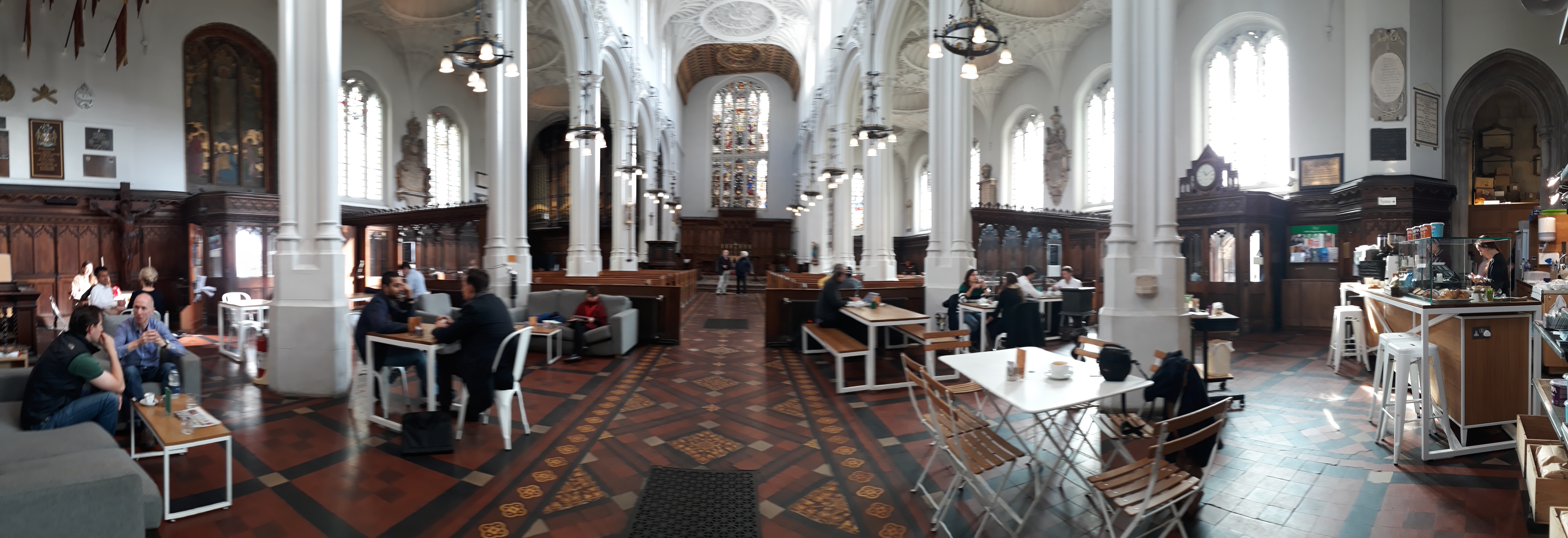 Me dirijo hacia las alturas. La última vez que estuve en Londres, el pasado enero, visité el Sky Garden, pero hacía tan mal tiempo que no tenían la terraza abierta y no se apreciaban las vistas. Con el día tan claro de hoy me decido a volver, sin reserva, porque además queda a sólo 10 minutos andando del hotel. En esta ocasión sí, la visita merece la pena, las vistas quitan el hipo. Hago muchas fotos. Me sorprendo de lo bajo que vuelan enormes aviones en su aproximación a Heathrow. Las siguientes paradas son un par de cafés de la City que ya tengo fichados. Uno de ellos dentro del edificio de la Bolsa, The Royal Exchange Grand Cafe. Mi gozo en un pozo pues están de obras y todo el patio interior está cubierto de paneles y andamios. Te ofrecen como alternativa el Grind en un lateral del edificio. Sigo pues hacia el otro, Host Café, en una iglesia del siglo XVII, St Mary Aldermary. Un lugar tranquilo, donde pasar un buen rato saboreando un buen café (2,80 euros), mirando alguna de las revistas y respirando paz. A tres minutos de allí vuelvo, también por segunda vez este año, a la terraza del One New Change, frente a la catedral de St Paul. Queda tan cerca que casi la puedes tocar, apreciar todos los detalles y hasta ver a los visitantes en lo alto de la cúpula. De nuevo impresionantes vistas sobre un despejado Londres. Paseo por la City, es tan fotogénica!!
