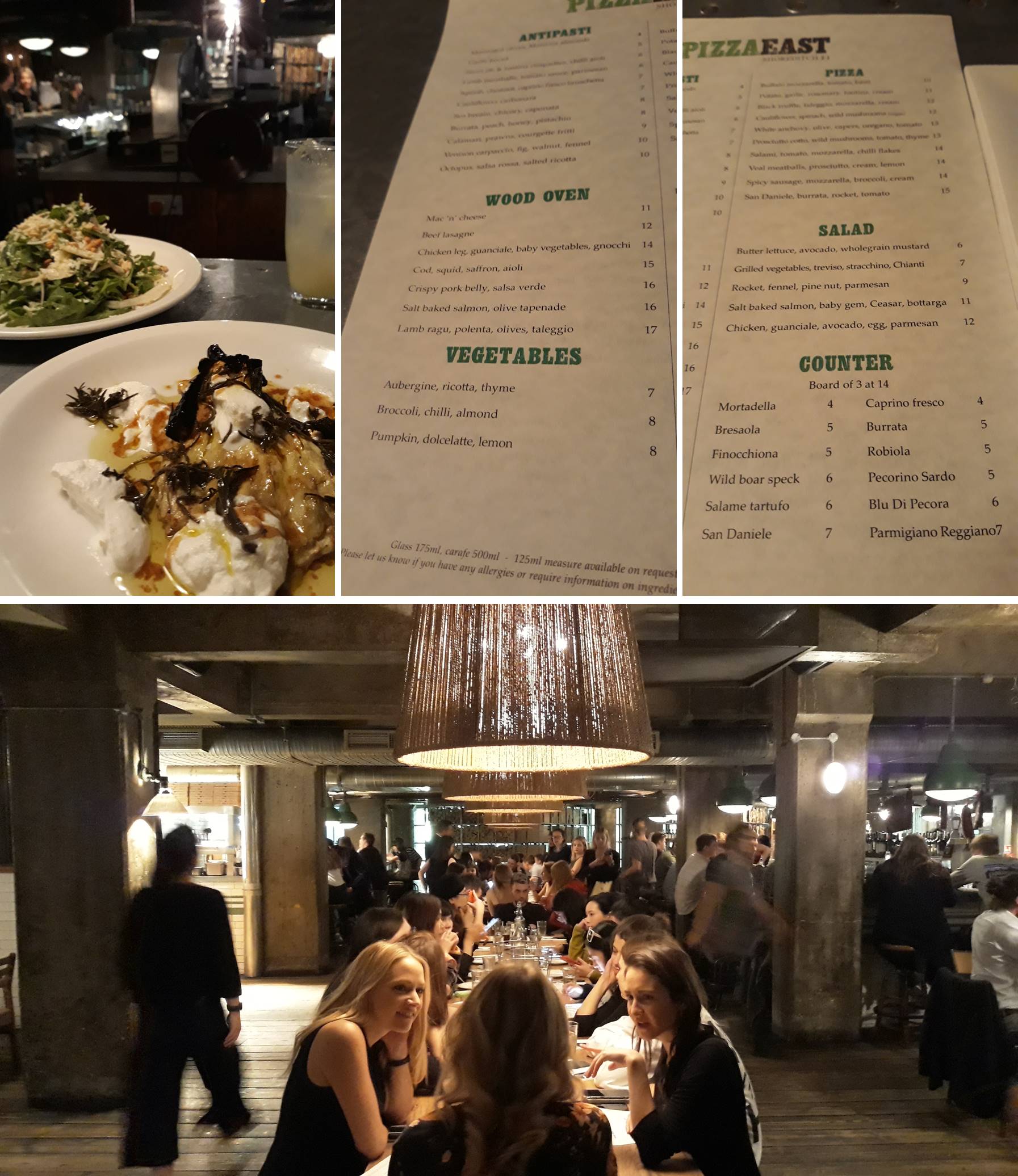 Estoy un rato en el hotel, y ya para cenar vuelvo a mi lugar fetiche, Pizza East, en pleno Shoreditch. El ambiente de este sitio es una pasada. Da igual la hora y el día, siempre está lleno y animado y siempre sales satisfecho. Han cambiado algo la carta, esta vez pido un plato de berenjenas asadas con ricotta y tomillo tostado y la habitual (no me canso, ahora siempre la hago en casa) ensalada de rúcula, hinojo, piñones tostados y parmesano. Eso y una limonada casera por 28 euros. Al salir vuelvo caminando al hotel y aprovecho para hacer más fotos nocturnas de los rascacielos y sus luces.