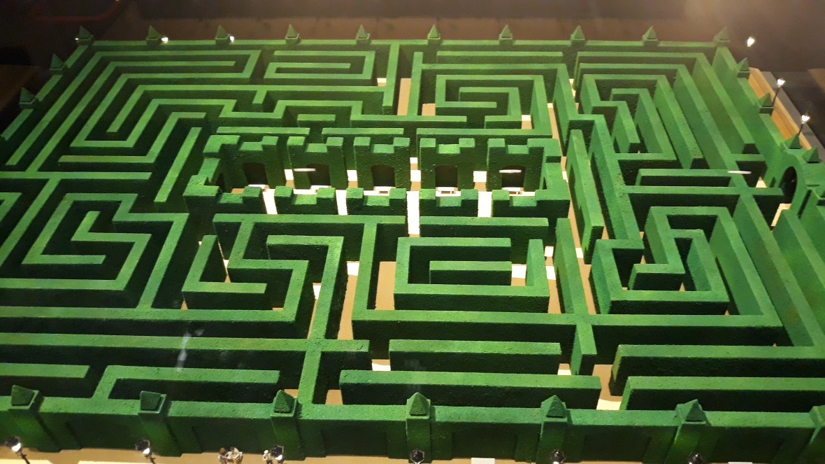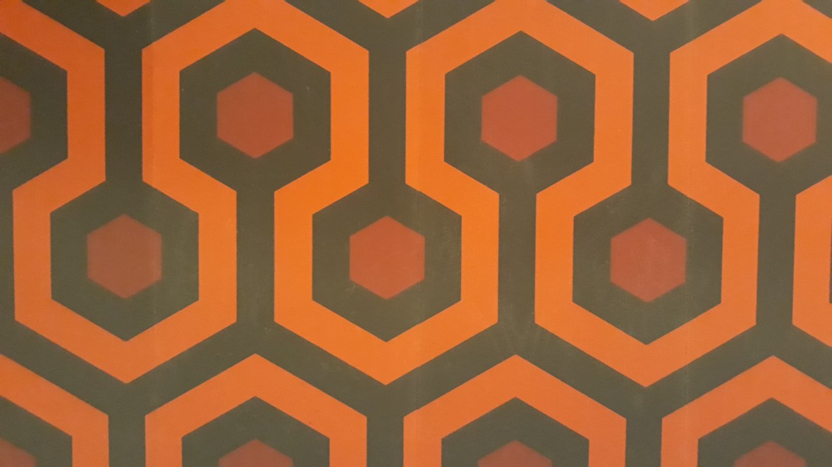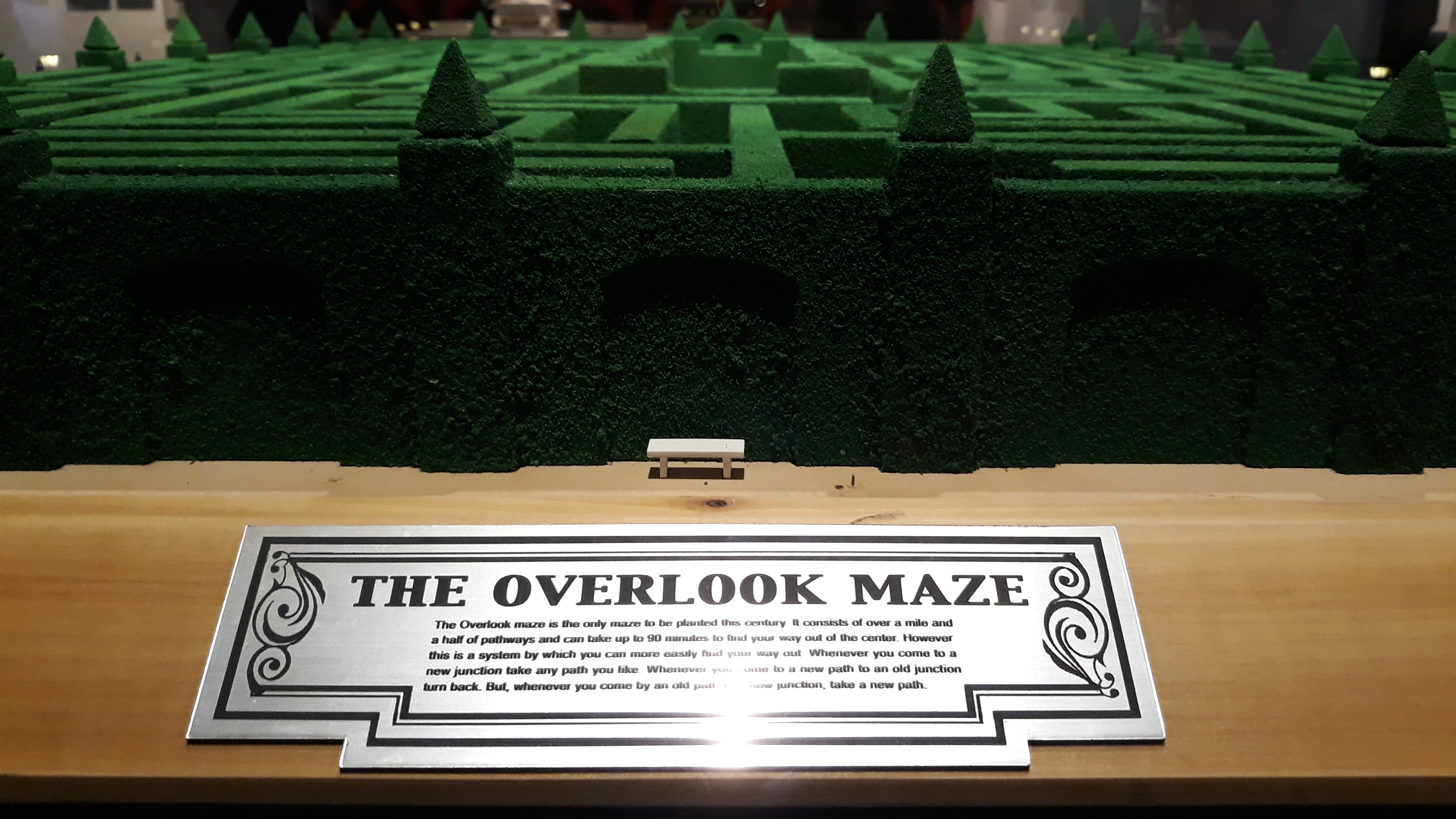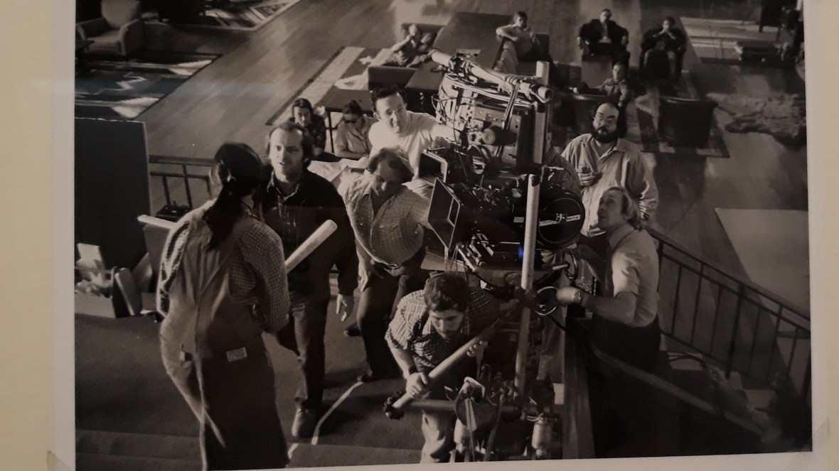 Seguimos por Barry Lyndon (tengo pendiente verla) para llegar a la película que para mí destaca por encima de cualquier otra: El Resplandor (The Shining). En la sala dedicada a este clásico del terror se encuentra: los vestidos celestes de las niñas gemelas, la máquina de escribir y el hacha de Jack o el cuchillo con que Wendy le corta en la mano en la célebre secuencia de la puerta. Hay curiosas fotografías del rodaje, metraje inédito, una pared con el famoso motivo geométrico de la moqueta de los pasillos del hotel, y una enorme reproducción del laberinto. Aquí nos hablan de la novedosa técnica utilizada para seguir al niño por los pasillos o por el laberinto, el steadicam, que utilizará después hasta la saciedad en otras películas.