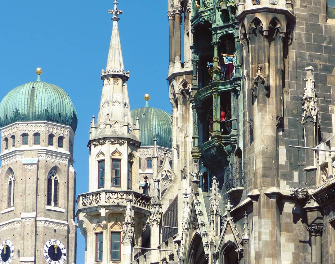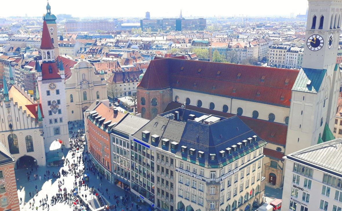 El casco histórico de Múnich es circular y está rodeado por tres grandes puertas de acceso, Karlstor, Sendlinger Tor e Isartor. Dentro de este perímetro hay calles peatonales, plazas, iglesias, y destaca por encima de todo la Marienplatz con la impresionante fachada del nuevo ayuntamiento (recuerda un poco a la Grande Place de Bruselas). Es obligatorio ver cómo danzan las figuritas del carrillón, a las 11, a las 12, y en primavera verano también a las 17 hrs. También es casi obligatorio subir a la torre, las vistas son increíbles en un día claro. Hay ascensor y cuesta 3 euros. En la plaza destaca también el antiguo ayuntamiento con su torre, ahora convertida en el Museo del Juguete, y las dos torres bulbosas de la catedral que asoman por un lado y la iglesia de Peterkirche por otro, también con su empinada torre a la que se puede acceder, a pie, por 3 euros.