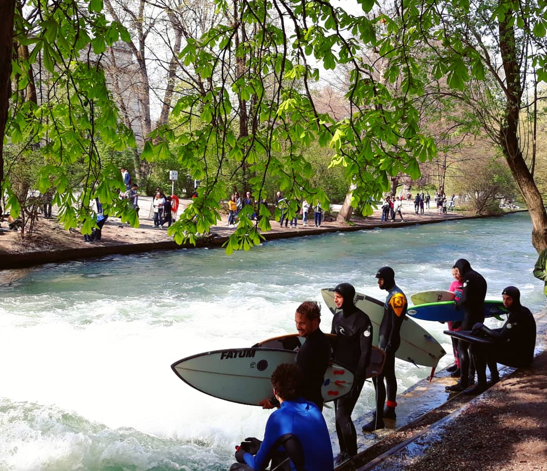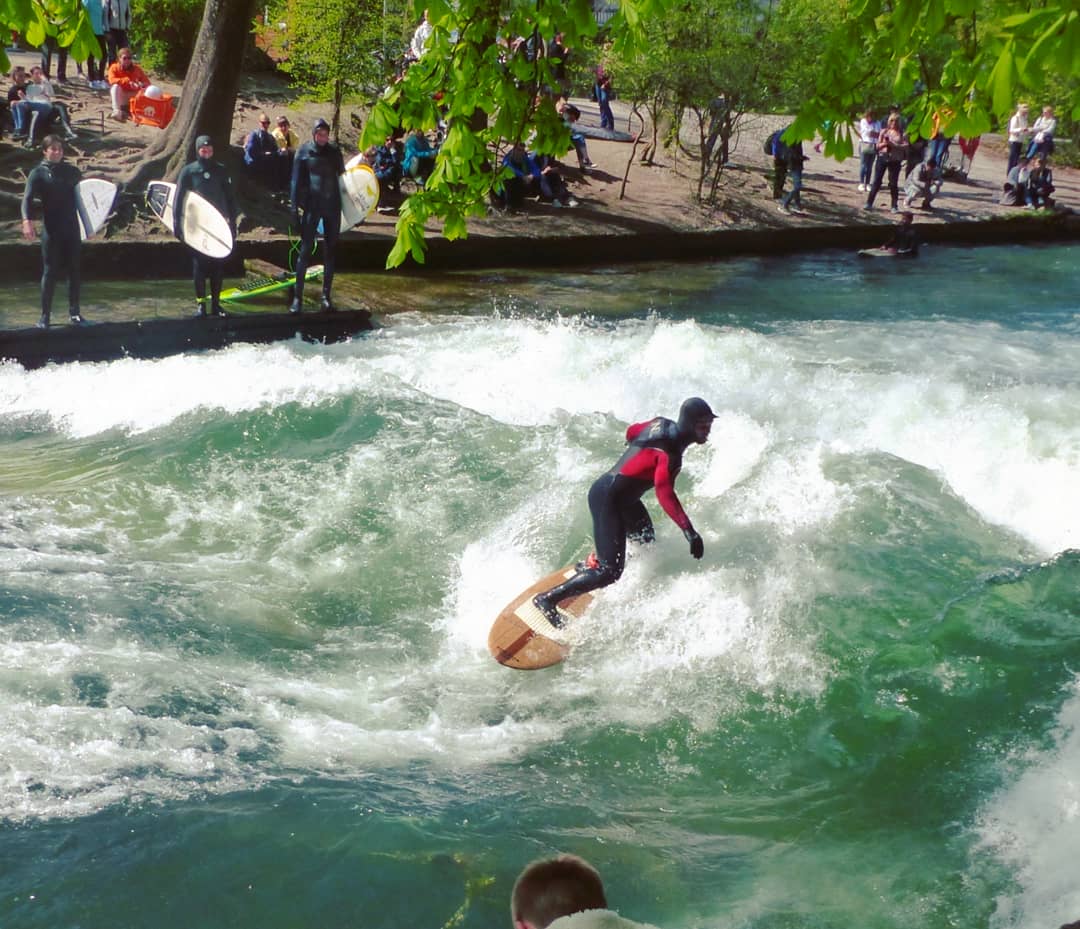 Si continúas dirección hacia el este por calles residenciales salpicadas de imponentes mansiones con jardines llenos de magnolios y aromáticos jazmines, llegas al Englischer Garten, el verdadero e inmenso pulmón de la ciudad. Aquí puedes disfrutar de una jornada entera. La parte norte más asalvajada y con un enorme lago; la parte sur más diseñada para el disfrute y esparcimiento con extensas praderas de césped, bosquecillos de robles y fresnos, riachuelos, pabellones… pasar un día de sol haciendo un picnic con amigos o con los perros es el pasatiempo favorito de los muniqueses. Justo en el centro se alza la pagoda china con un gigantesco biergarten a sus pies, muy concurrido y con música tradicional en directo. No puedes salir del parque sin pasar por la famosa ola, en el extremo sur. Aquí el río Eisbach se vuelve caudaloso y el desnivel forma unos rápidos al salir de un puente donde se genera una ola muy afamada por los surfistas, que hacen cola para tirarse de uno en uno, haga frío o calor. Es todo un espectáculo.