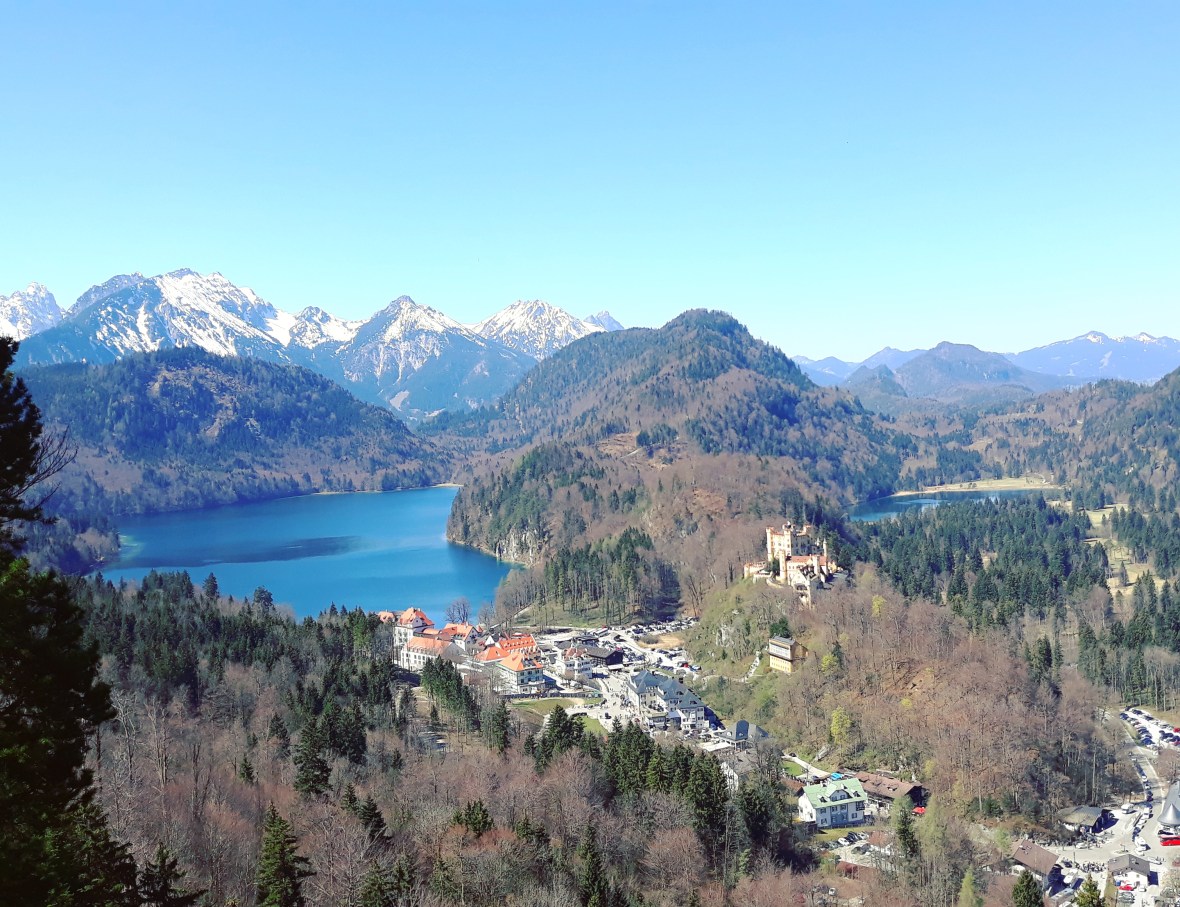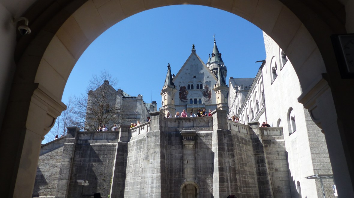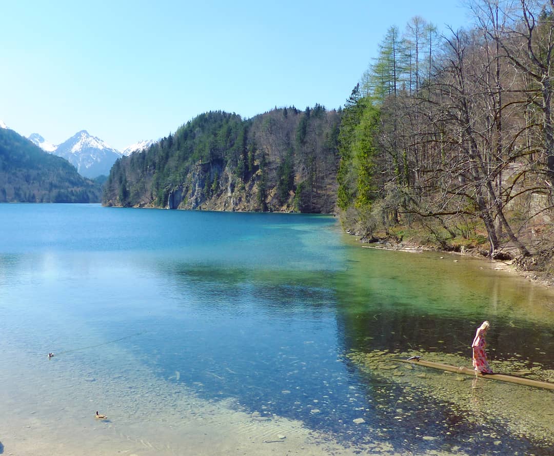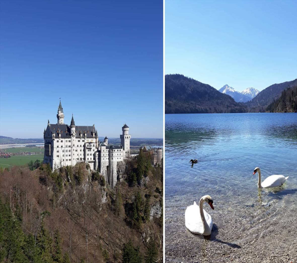 Casi dos horas en autobús, con los Alpes Bávaros y sus cimas nevadas cada vez más cerca. De pronto ahí está el castillo de Neuschwanstein, incrustado en la inmensidad de las montañas, con sus agujas y torres. El bus aparca en el pequeño pueblo de Hohenschwangau, donde también destaca su castillo amarillo en lo alto de una colina. Pero el principal reclamo es el castillo del rey loco o de Disney, ya que sirvió de inspiración para el castillo de la bella durmiente. Hay varias opciones para subir: a pie unos 40 minutos por una empinada cuesta, en coche de caballos, o en un servicio de minibus. Yo recomiendo esta última opción. ¿Por qué? Porque te deja a los pies del puente de María, Marienbrucke, desde donde se obtiene la mejor y más espectacular vista del castillo. Nosotros así lo hicimos y apenas tuvimos que hacer cola, en cambio otros que decidieron subir a pie cuando llegaron al puente la cola era ya de horas y se quedaron sin verlo. Desde el puente al castillo hay una corta caminata de 15 minutos, y finalmente la bajada se puede hacer perfectamente andando. El castillo en sí no es gran cosa. Aunque es de estilo historicista medieval, se ve nuevo, de una época reciente, y eso le resta algo de encanto. Lo que sí impresiona sin duda es el entorno en el que está construido, es apabullante. A sus pies está el lago Alpsee, con patos y cisnes.