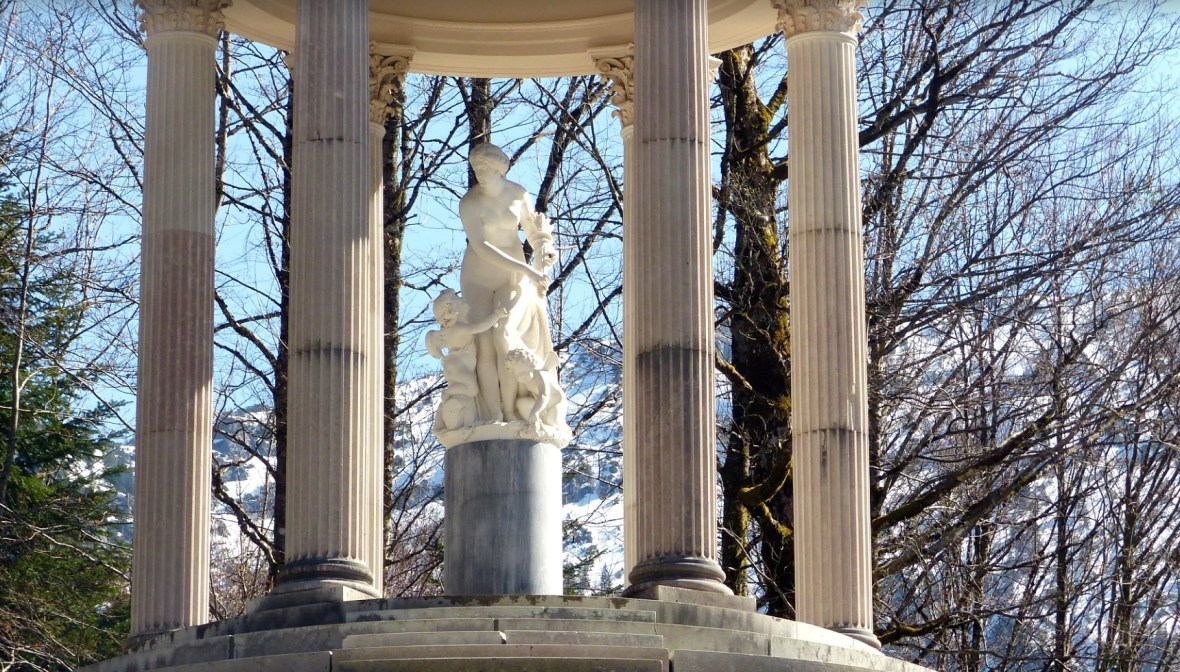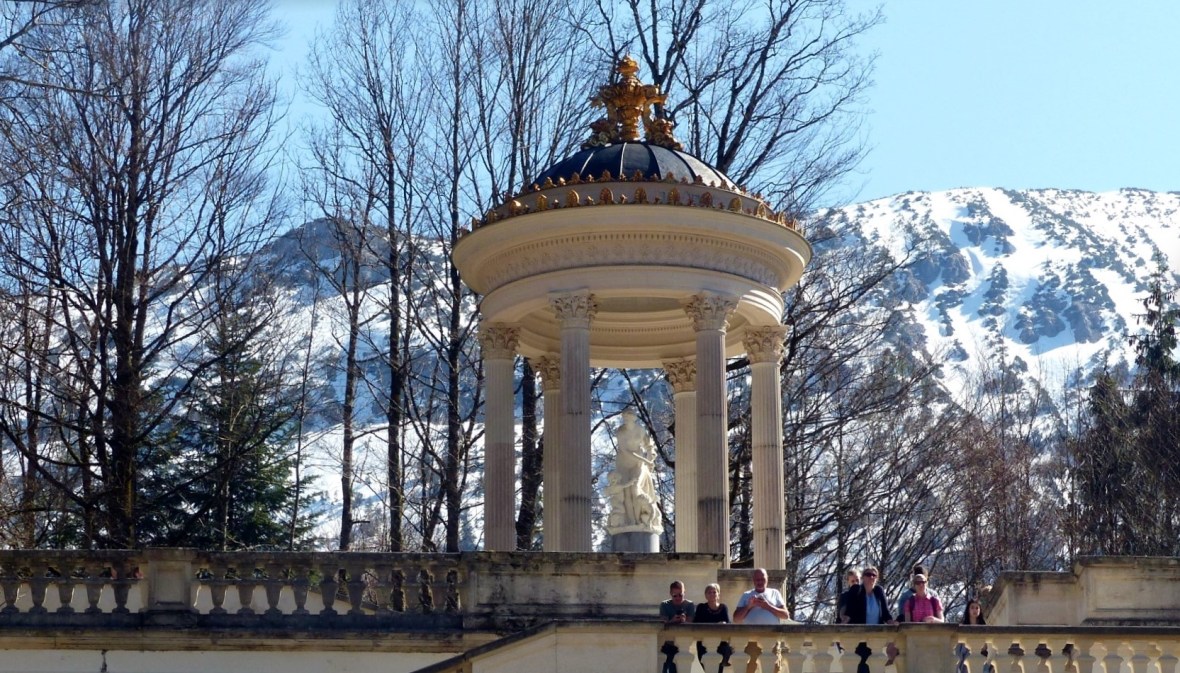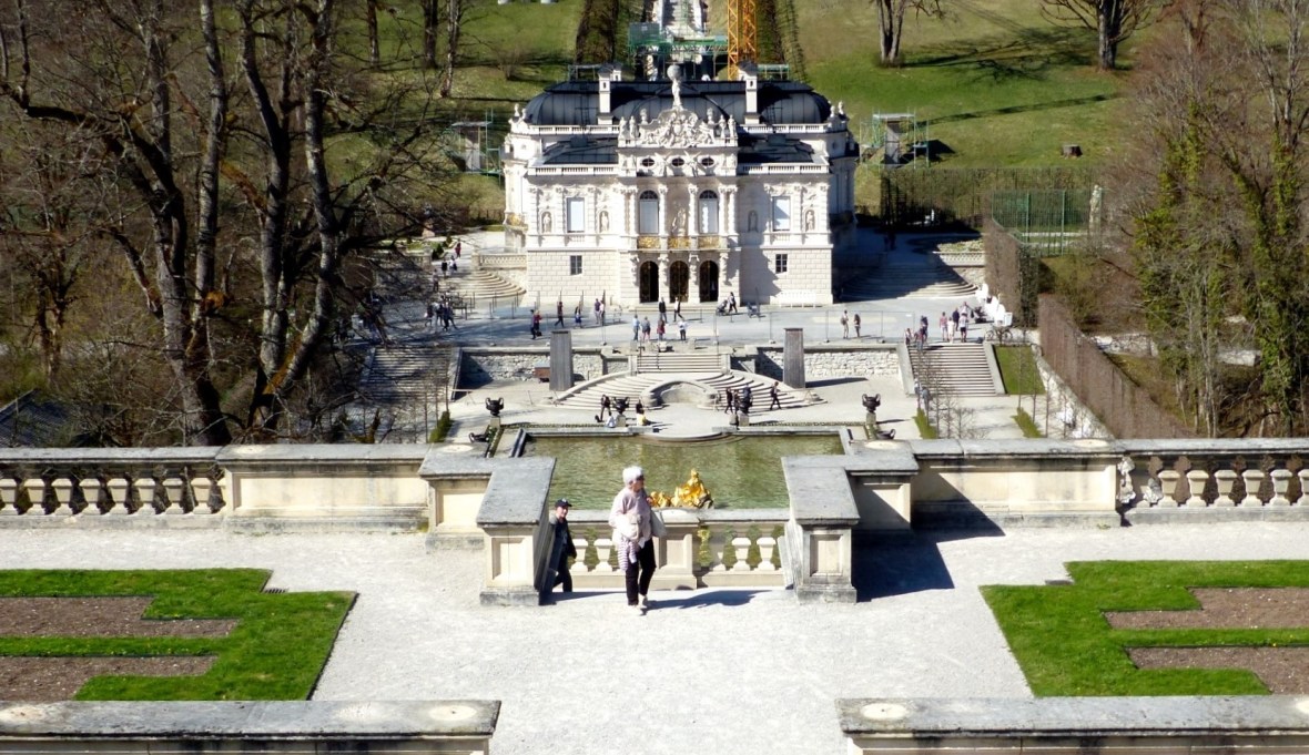 El palacio de Linderhof es otra historia, otro estilo. Más coqueto y elegante, está situado también en un entorno impresionante, más cerca aún de las cumbres nevadas y con un majestuoso parque y fuentes. El estilo versallesco y palaciego parece fuera de lugar en un entorno tan agreste y montañoso.