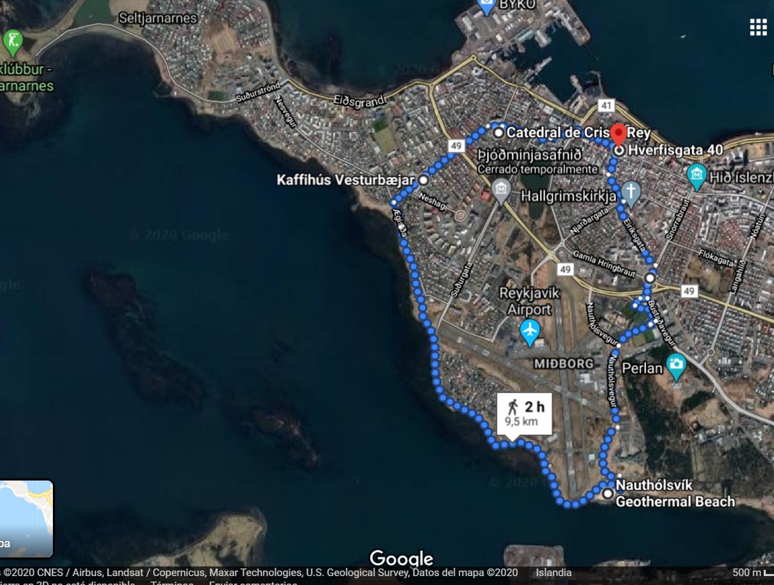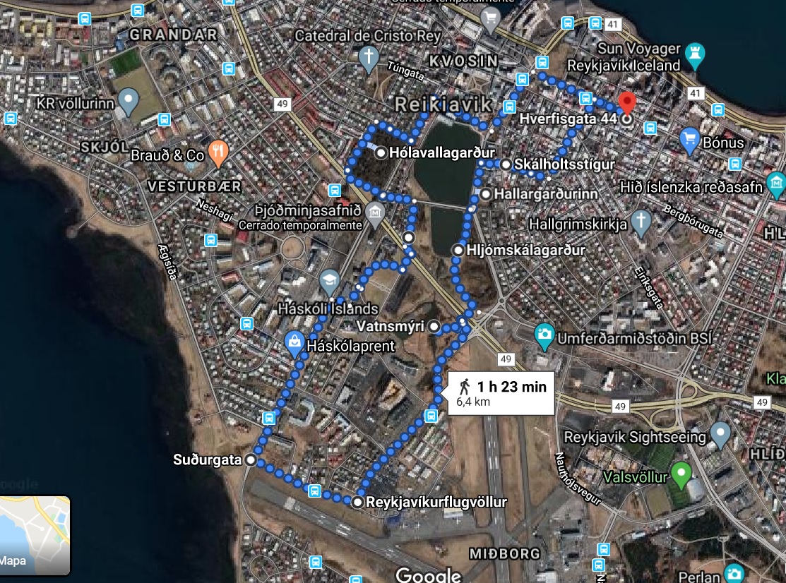 Partiendo desde mi casa, subes hasta la iglesia Hallgrímskirkja para después volver a bajar ladera abajo hacia el Landspítalinn. Desde allí tienes dos opciones para llegar hasta la playa Nautholsvík, o bien bordeando las pistas del aeropuerto o bien por el camino de bicicletas a los pies del monte Perlan.