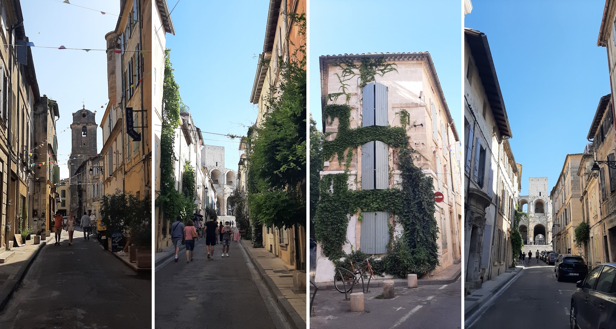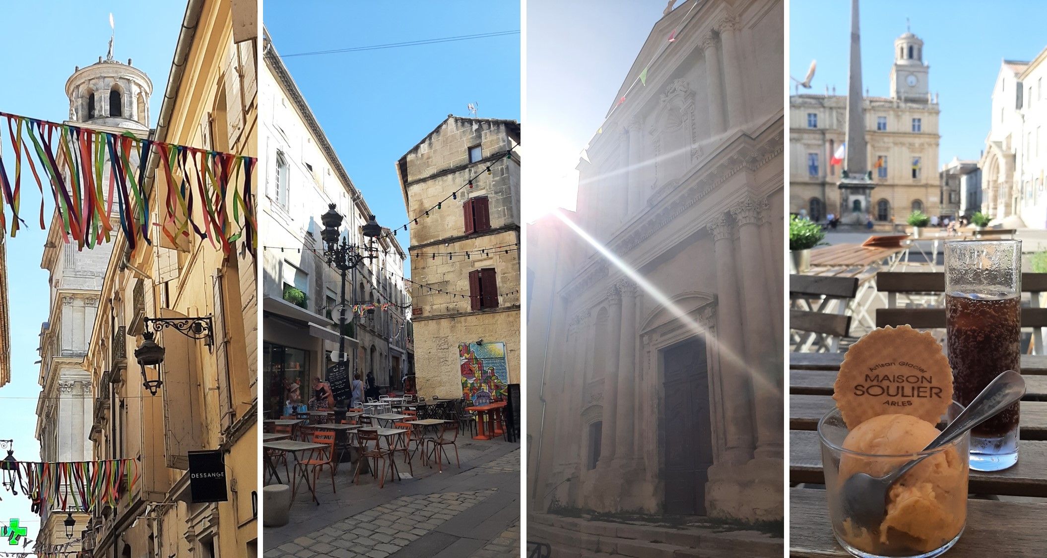 Y ya para acabar el día, puse rumbo a Arles, otra ciudad con fuerte presencia de restos romanos, el teatro y el anfiteatro, conocido como Les Arenes, donde aún se celebran corridas de toros. De hecho, la ciudad está llena de referencias a ese espectáculo. Además de esos dos monumentos, las calles de Arles están llenas de casas de aspecto abandonado, muy decadente, pero con cierto encanto. Callejeando hasta que vas a dar con enorme la plaza del Ayuntamiento, con un monumento en cada costado. Sitio y momento ideal para tomar un helado.