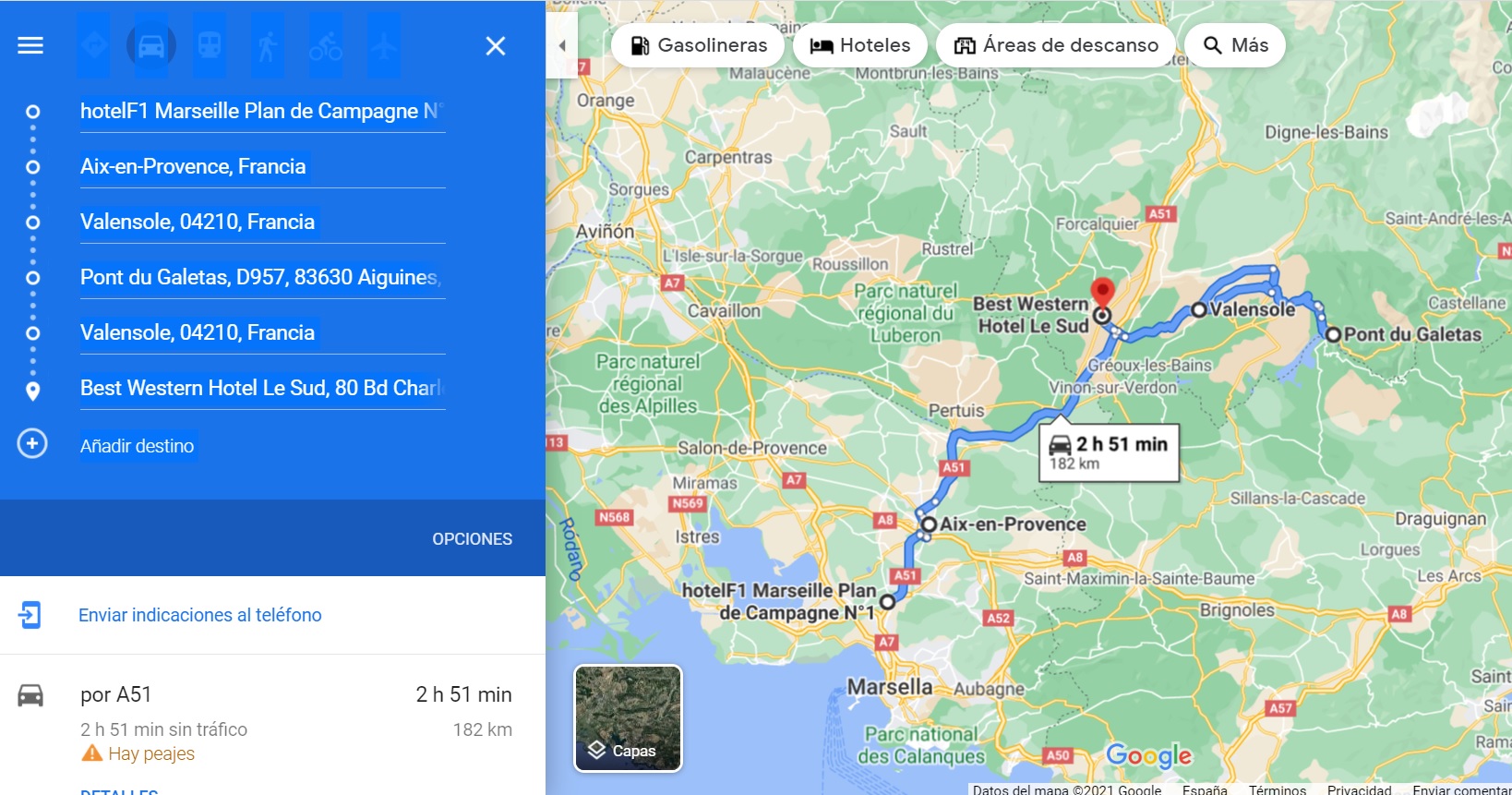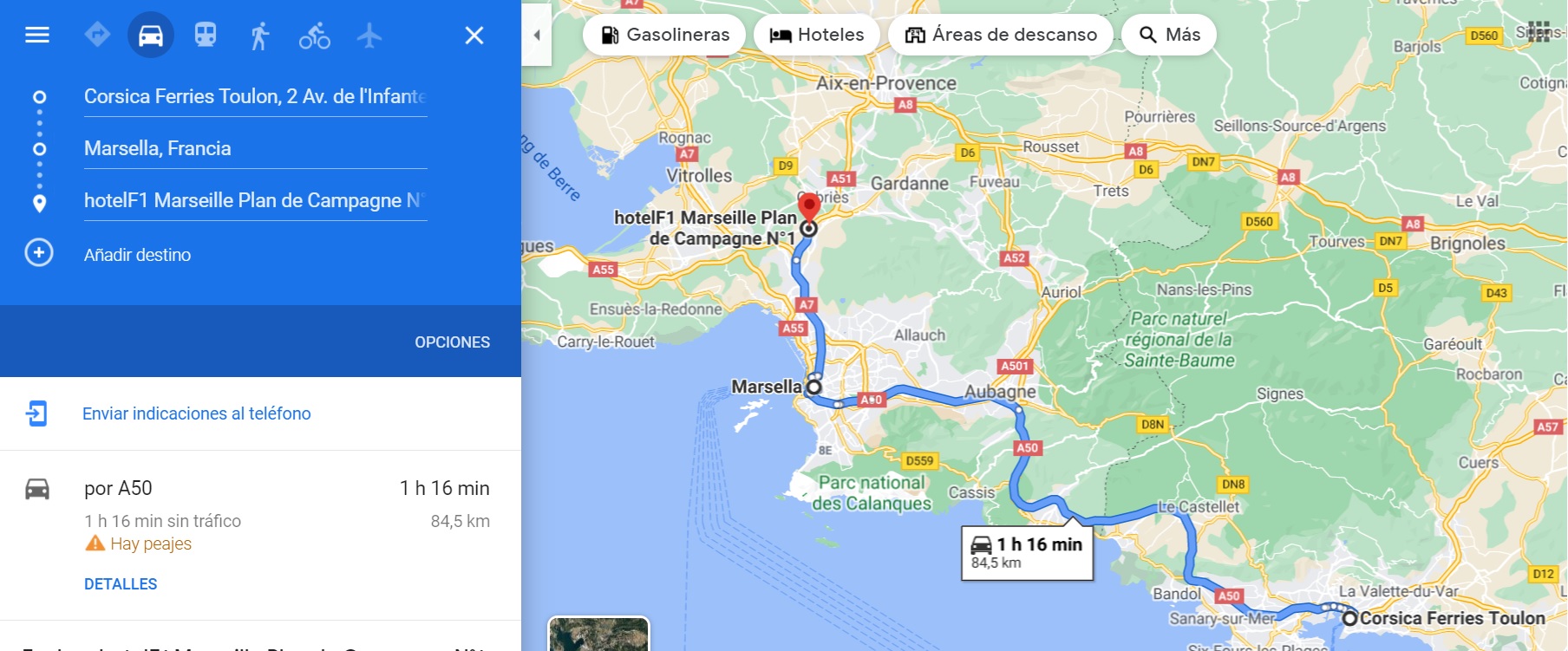 Datos prácticos: 85 kilómetros, 3 peajes de precio fijo (de pagar directamente, sin recoger ticket): 7,50 euros. Dos de 2,30 + uno de 2,90 para entrar en Marsella por el túnel del Prado.