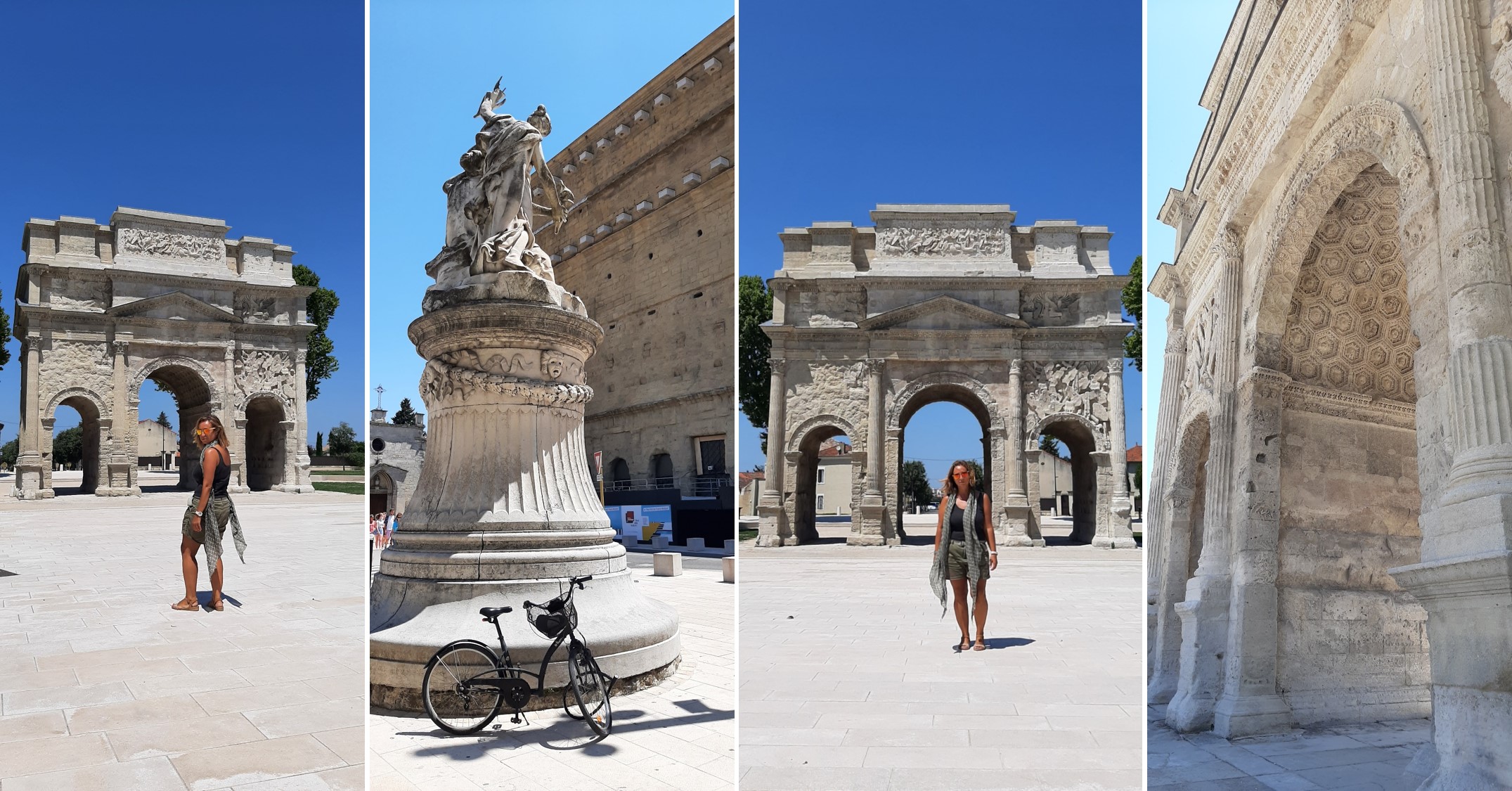 Decido tachar de la lista Vaison-la-Romaine, demasiadas horas de coche, ya era casi mediodía y me quedaba mucho por delante. Me dirijo pues a Orange, una pequeña ciudad con algunos de los restos romanos más importantes de Francia, un teatro conservado entero y un arco de triunfo detalladamente esculpido. Este día fue el peor de calor sofocante y a esas horas no había apenas nadie por la calle.