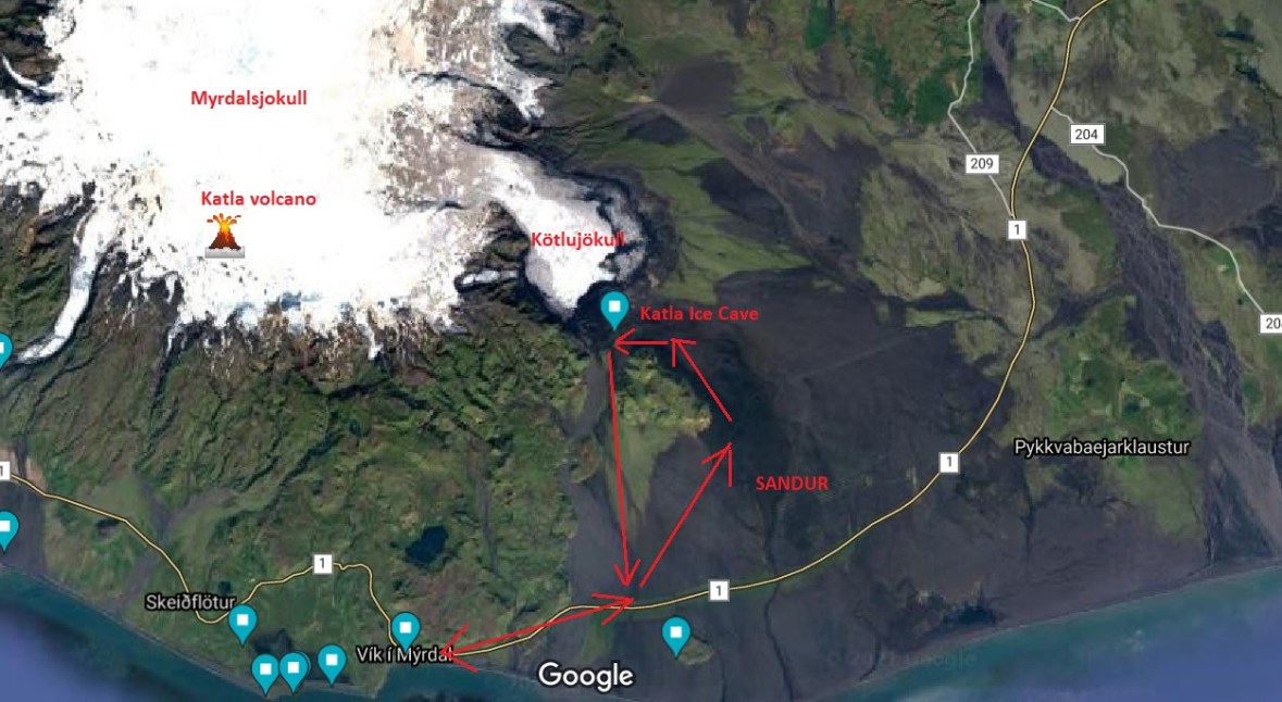 La Katla Ice Cave se encuentra dentro de los muros del glaciar Kötlujökull, una de las lenguas del Myrdalsjokull. Ese glaciar esconde en su interior al volcán Katla, dormido y temido, uno de los más poderosos de Islandia. Para entender su importancia en su última erupción generó el enorme sandur que se puede apreciar en el mapa.