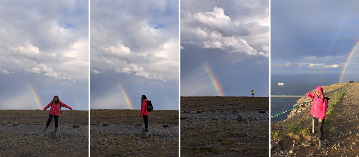 Esa tarde había estado lloviendo y estuve a punto de cancelar mi visita, estando sólo a 15 minutos en coche de aquí. Me planté a mí misma y me dije, pero qué demonios?!!? No has venido hasta aquí para quedarte entre cuatro paredes. Que llueve? Pues chubasquero, botas y p’alante! Así que sobre las 8 de la tarde llegué a Cabo Norte. Y suerte que lo hice porque el cielo se fue abriendo, y las nubes hacían la estampa más fotogénica si cabe. Con decir que apareció un intenso arco iris que acababa sumergiéndose en el mar! Fue absolutamente mágico!