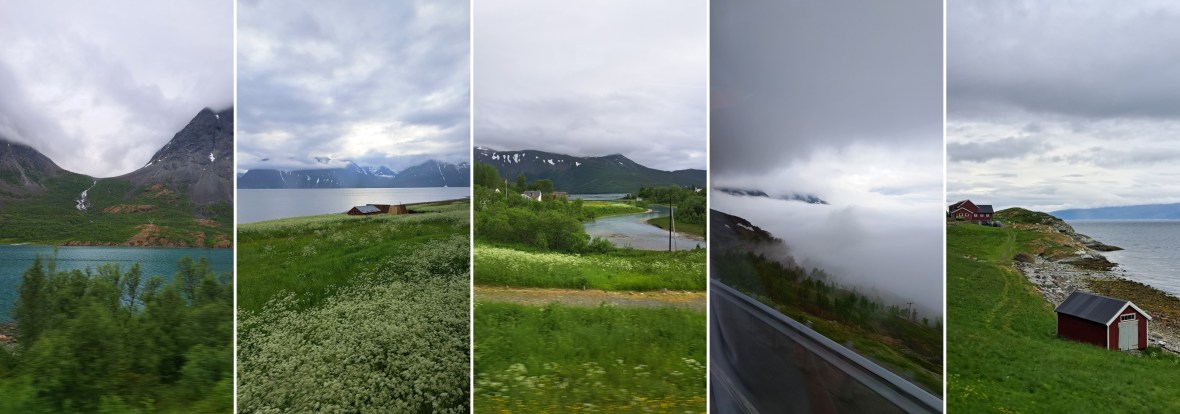 Así que me planifiqué de acuerdo al horario del único bus, el 150, que hace el recorrido desde Alta, un domingo a las 14.15 hrs. Amaneció lloviendo y con una densa niebla, así que agradecí no tener que ser yo la que condujera. Por suerte el hotel donde había pasado la noche, el Thon Hotel Alta, estaba pegado a la parada, y puntual como un reloj suizo partía el bus. El billete sencillo cuesta unos 45 euros y son 6,40 horas de trayecto, que incluye el pase de los dos ferrys, de Olderdalen a Lyngseidet (unos 45 minutos) y de Svensby a Breivikeidet (una media hora). También hay un par de paradas en gasolineras para comprar algo o ir al baño. A pesar de quedar un poco deslucido por la niebla, el recorrido fue precioso, casi siempre bordeando la costa y sorteando las diferentes entradas del fiordo, pero también en un momento el bus sube una montaña donde todavía había rastros más que evidentes de nieve. A medida que me acercaba a Tromsø ya fui reconociendo las carreteras de mi anterior visita en diciembre, aunque obviamente se veían completamente diferentes al invierno.