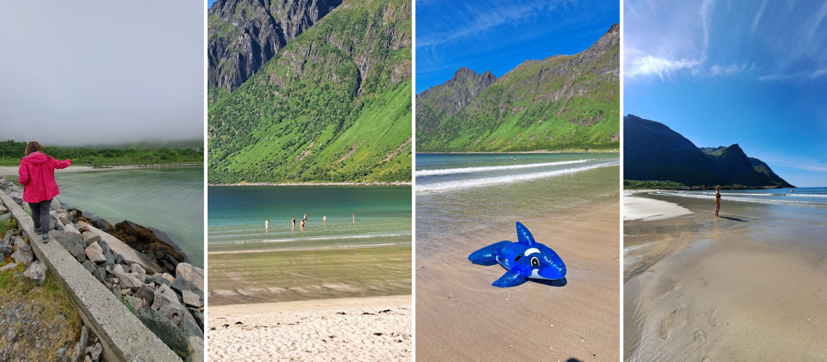 El contraste del agua turquesa, la arena dorada y las enormes montañas con nieve todavía en sus cimas, configura una imagen de postal. Es una playa muy amplia, y el día que fui a pasar la tarde, después de hacer la ruta de Hesten, estaba llena de familias comiendo, con sombrillas, colchonetas, perros, un día de playa normal como el que puedas imaginar en España a finales de junio. Gracias a los 24 grados que hacía ese día, era la oportunidad única para poder bañarme en el Ártico, así que ahí me metí, el agua del mar estaba a 10 grados y me sorprendió que no me costó tanto como esperaba, a pesar de que el fondo era muy bajo y había que andar mucho mientras te salpicaban las olas. No sólo me metí, sino que nadé un buen rato. Sin embargo, otra vez los molestos tábanos hacían casi imposible poder disfrutar de la playa con tranquilidad.