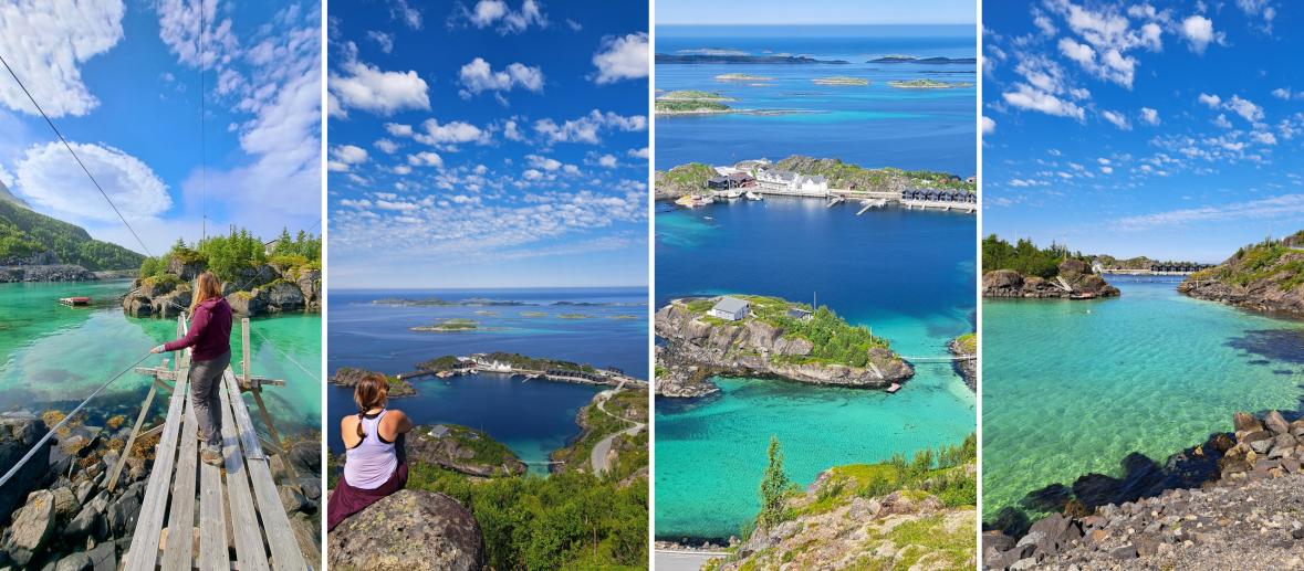 Sigues la carretera y llegas al mini pueblo de Hamn i Senja, bueno, realmente ni es pueblo ni es nada, se trata de un hotel, uno de los mejores de la zona. Pude dar fe tomándome un café en los salones de su acogedora y lujosa cafetería. El entorno es brutal, tiene un puerto, unas casitas junto al mar, un faro, un despliegue de multitud de actividades náuticas, en unas aguas tranquilas y de un color azul indescriptible. Me llamó mucho la atención, justo a la entrada del acceso al hotel, una caseta plantada en medio de un islote de roca, y a la que sólo se podía acceder por un puente colgante. El agua que rodeaba, por favor….. sentí ganas de llorar cuando vi tremenda maravilla. Aquí una foto aérea en invierno, pero mis fotos abajo os mostrarán cómo luce en verano. Otra foto de Hamn desde el cielo. Estas fotos aéreas me dan la vida, me parecen fascinantes para ver todos los detalles!