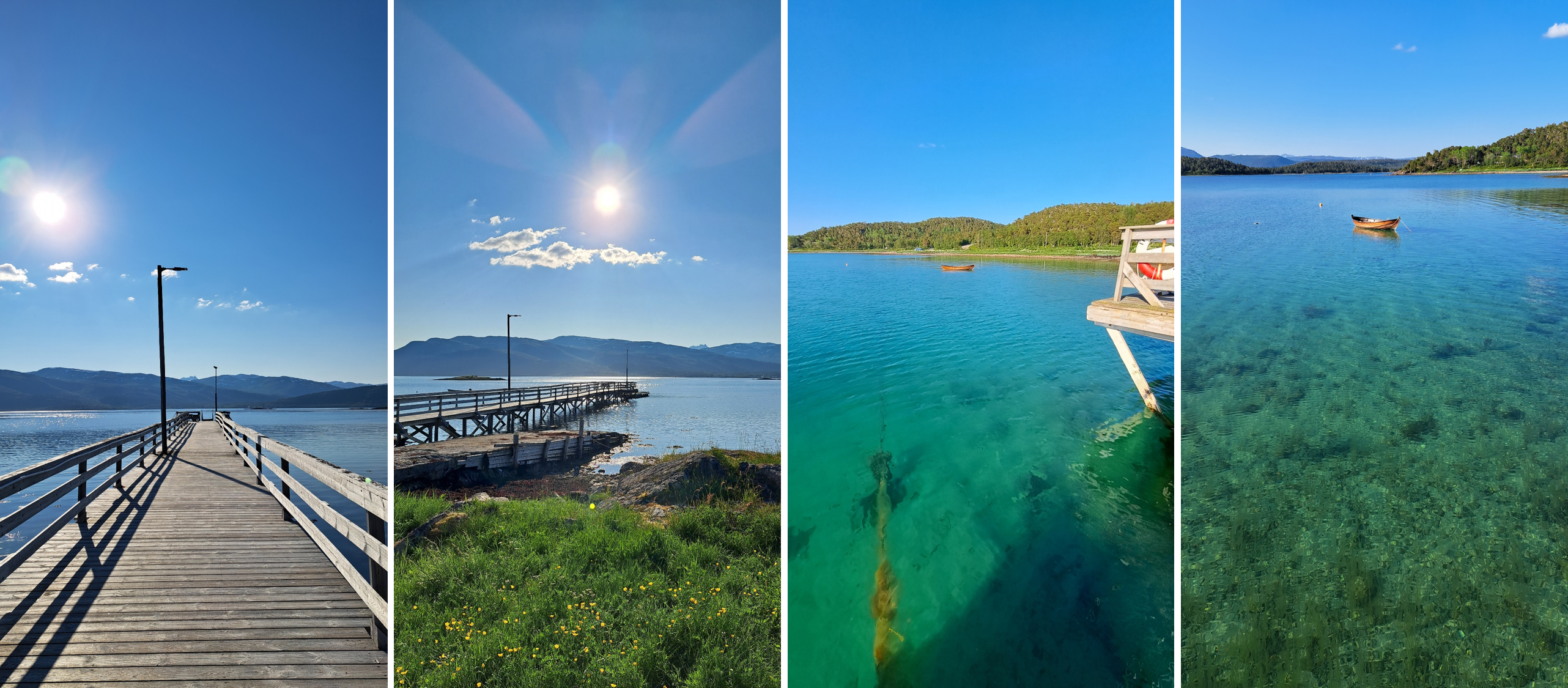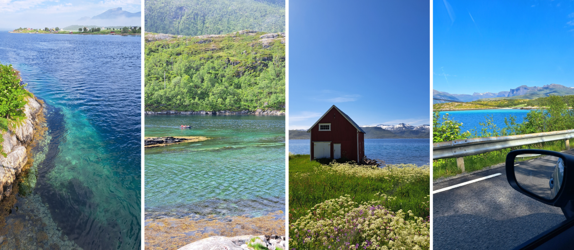 Luego, me dirigí a Solstrand, en la zona de Refsnes, una área con playas de un azul intenso. Para llegar allí, tuve que desviarme desde la carretera 860 por un camino de grava. La inmensidad del mar, tranquilo como un espejo y con un azul que solo he visto en Mallorca, se puede apreciar en esta foto aérea. Durante todo este trayecto, prácticamente no me crucé con nadie. La tranquilidad, el silencio y la calma fueron las características más destacables de la zona sur, algo que contrastaría con lo que me esperaba en el norte.