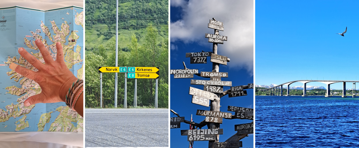 1- Por la carretera E8, que conecta tres países: Noruega, Suecia y Finlandia. Aproximadamente una hora después de salir de Tromsø, hay que tomar el desvío por la E6 hacia el oeste. Esta fue la ruta que yo elegí tanto para la ida como para la vuelta, aproximadamente 2 horas y media hasta llegar a Finnsnes, la puerta de entrada a Senja, justo antes de cruzar el puente que la separa del continente. Luego, ya en Senja, hay que sumar una hora más para llegar, al norte, al primer fiordo.