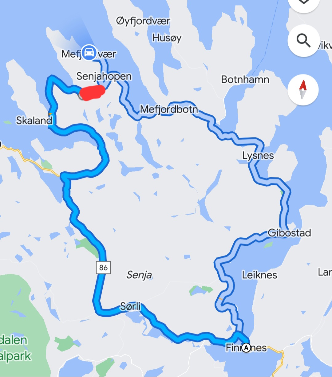 No sería un drama porque de punta a punta son unos 60 kilómetros y no supone una enorme locura ir y volver. La complicación viene con los túneles y sus horarios y restricciones. Consultad siempre por favor el estado de los mismos en la web oficial, ya que os puede pasar como a mí, que estaba a 15 minutos de mi destino y, por confiarme, el cierre de un túnel me obligó a dar la vuelta completa a la isla, más de 2 horas añadidas de carretera tontamente. Concretamente fue el Geitskartunnelen, entre Senjahopen y Ersfjord, que suele tener restricciones de paso nocturnas, a las 6 de la tarde se cerraba y hasta las 6 de la mañana no volvía a abrirse. Aunque es posible que encuentres algunas horas de paso autorizado en convoy, e incluso algunos fines de semana de apertura. (Me di cuenta tarde, cuando ya casi había completado la vuelta, que podía haber esperado para cruzar con el siguiente convoy).