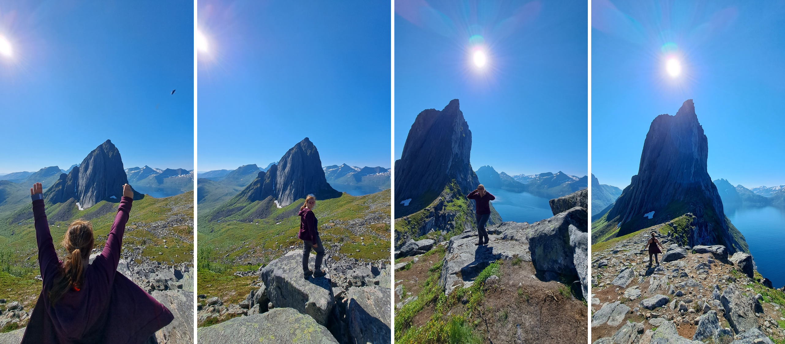 Desde Hesten el Segla queda al sur por lo que verás su cara norte. Sin embargo, justo antes del túnel que da acceso a Fjordgård, se inicia la ruta de subida al pico Barden, de 659 metros, y desde allí se puede ver la cara sur del Segla, que queda un poco más bajo. Yo ya había tenido suficiente caminata y mi siguiente destino era pasar la tarde en la playa de Ersfjordstranda. Creo que fue el día más caluroso de mi viaje a Noruega.