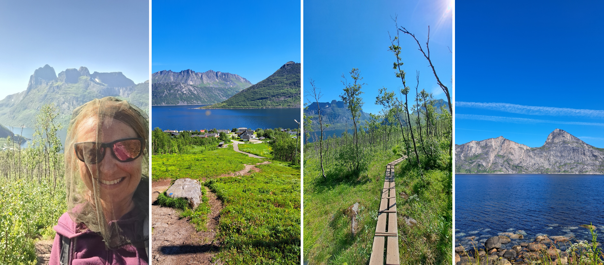 Desde aquí parte, por dos caminos distintos, la ruta hacia el pico Sukkertoppen (450 metros). Intenté la subida pero sólo me quedé a medio camino, en la zona del mirador Utsikten. Estoy cero en forma! Desde aquí, además de tener a tus pies todo el puertecillo de Hamn, se divisa a la perfección todos los islotes de los que os hablé antes, Bergsøyan, a los que se puede llegar en kayak. Skaland y Bøstranda quedan al otro lado de la bahía. No creo que pueda haber un momento más contemplativo y de paz interior que quedarte un buen rato observando los detalles, si no fuera por los malditos tábanos incordiantes! El camino es muy sencillo, y se puede hacer por dos lados. Yo me decanté por partir de este punto, y pasando por una pequeña presa de agua llegas rodeada de mosquitos, eso sí, al pico-mirador. Pero también es posible acceder desde aquí, que es por donde bajé.