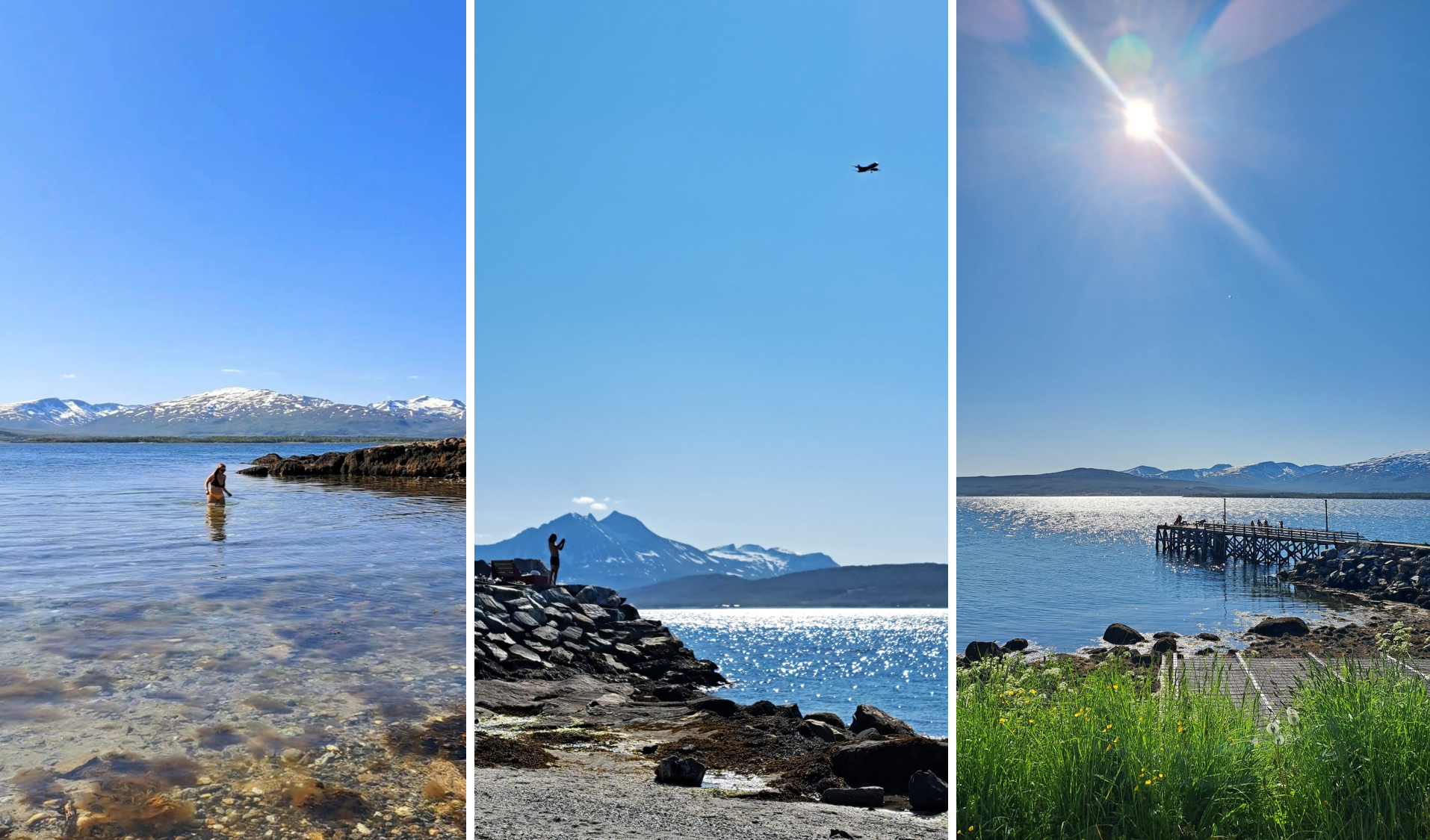 Decidí dar un paseo hasta la zona donde residí en diciembre y me acerqué a la playa de Telegrafbukta, el lugar donde pasé tantas noches esperando la aurora boreal. En invierno ni me lo planteé, pero esta vez, estaba decidida. Me puse el bañador y me aventuré en el agua, aunque sólo llegué hasta la cintura. La marea estaba algo baja y para sumergirme completamente, tenía que caminar bastante sobre un suelo lleno de rocas y piedras. Al final, desistí de la idea. Pero sigue leyendo, porque sí tuve la oportunidad de bañarme en Noruega en verano…