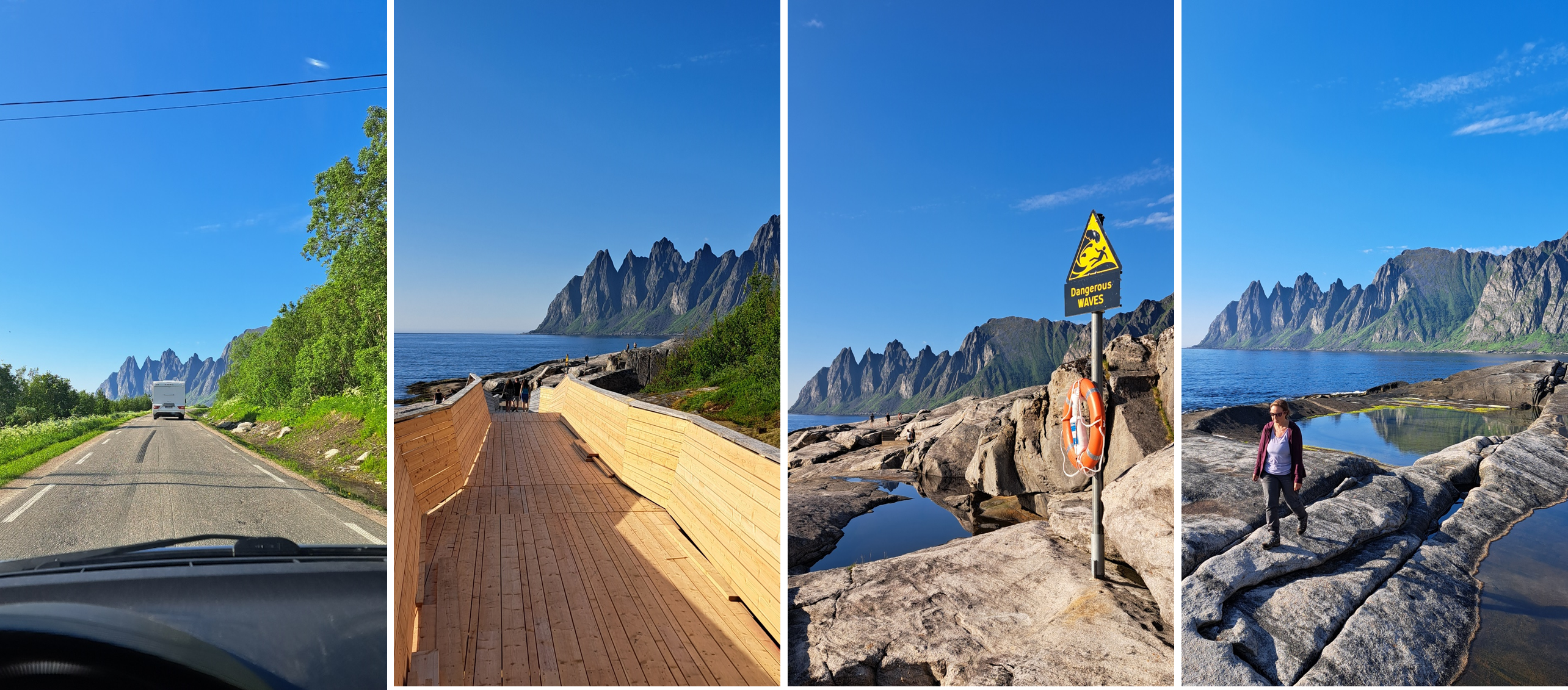 Seguimos carretera, siempre hacia el oeste, y nos encontramos con un pequeño aparcamiento, donde caben unos 10 coches, junto a una pequeña caseta (aseos) y una pasarela de madera sobre las rocas. Diréis, ¿qué es esto? No veo una playa, ni una cascada, ni un puerto… nada. Hay que bajar la rampa de madera, plantarse en las rocas y seguir hasta la punta. Los picos de las montañas que te quedan delante, al otro lado del pequeño fiordo de Ersfjord, son la gran atracción aquí. Este mirador se llama Tungeneset, y se le conoce como Devil’s Teeth o Dientes del Diablo, por lo afilado y escarpado de los picos. Si te acercas más hasta la punta de las rocas, hay pozas de agua encharcada, que dan muy bien para hacer fotos de reflejos.