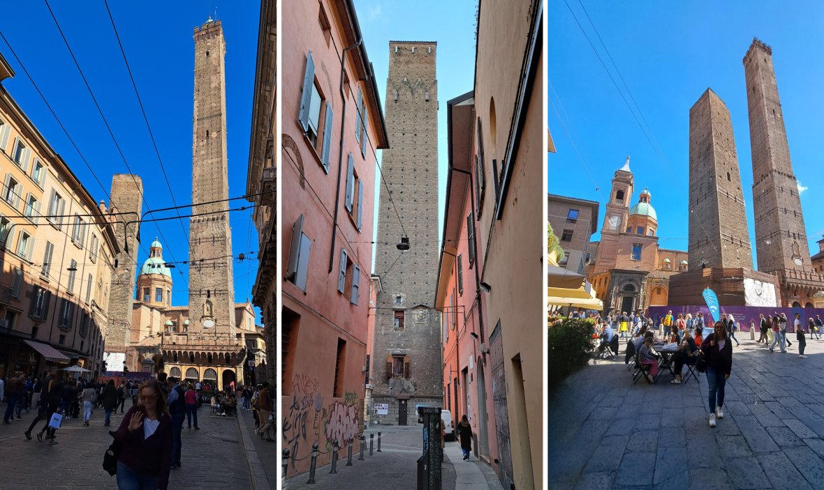 Si algo destaca en Bolonia son sus torres medievales! Llegó a tener hasta casi 200 torres, se dice que construidas por familias ricas para demostrar su poderío. Hoy día las dos más famosas que quedan en pie son la torre Garisenda y la torre Asinelli, las dos juntas al final de la Via Rizzoli. Ambas están inclinadas lo que las hacen más peculiares. También es interesante subir a la Torre Prendiparte, ya que desde su azotea (después de subir lo equivalente a 12 pisos) se pueden apreciar las otras dos famosas torres.