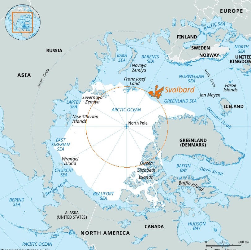 Es sólo cuando lo ves desde la perspectiva del polo norte, y con la línea del paralelo 80º, que te das cuenta que efectivamente apenas hay nada más al norte, sólo un trozo de Groenlandia, algunas islas rusas y otras islas canadienses, todos ellos territorios no habitados. Y te das cuenta también que el archipiélago roza el borde del casquete polar.