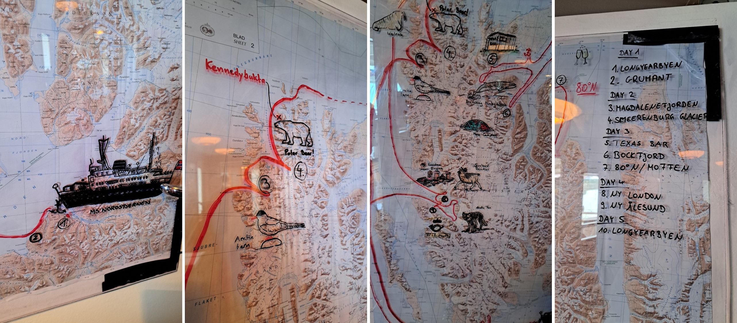 La logística a bordo del barco seguía un programa meticulosamente planificado. Como mencioné anteriormente, el desayuno se servía a las 8 de la mañana, y a las 9 teníamos la reunión diaria obligatoria, donde se nos presentaba el plan del día y se nos explicaba todo lo necesario sobre los dos landings, el tipo de trekkings que realizaríamos, las alternativas disponibles, las normas de seguridad, entre otros aspectos. Esta rutina se repetía cada día, salvo el primero, cuando embarcamos por la tarde, ahí se nos proporcionaron instrucciones sobre qué hacer en caso de emergencia y se presentó al equipo de guías, un total de siete, incluyendo a la líder de la expedición, Hedda. Durante ese primer día, se formaron varios grupos según el idioma: un grupo de alemanes, dos grupos variados de escandinavos, y un gran grupo compuesto por italianos, británicos y nosotros, los únicos españoles, que se dividió en tres. A cada grupo se le asignó un guía para todo el viaje, siendo la francesa Cecily la nuestra.
