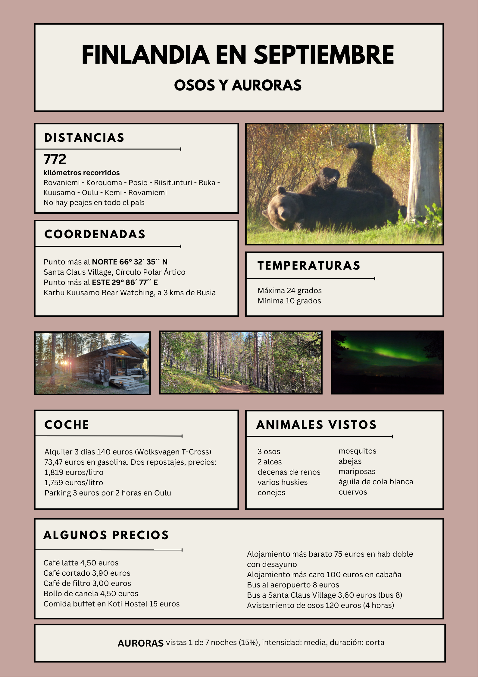 La ruta que he seguido ha dibujado un triángulo casi perfecto, con Rovaniemi, Kuusamo y Oulu en los tres vértices, y ha atravesado el país de lado a lado, desde la frontera con Rusia en el este hasta el golfo de Botnia en el oeste, 772 kilómetros. El verdadero objetivo de este viaje era poder ver osos en libertad, pero en septiembre se pueden ver ya las primeras auroras y eso puede suponer un plus, una motivación adicional. Sin embargo, no he tenido mucha suerte ya que el tiempo no me lo ha puesto fácil, durante el día lucía un sol, casi a veces molesto, con máximas de 21-24 grados, pero por la noche con la bajada de temperaturas entraban nubes que lo tapaban todo e imposibilitaban la visión.